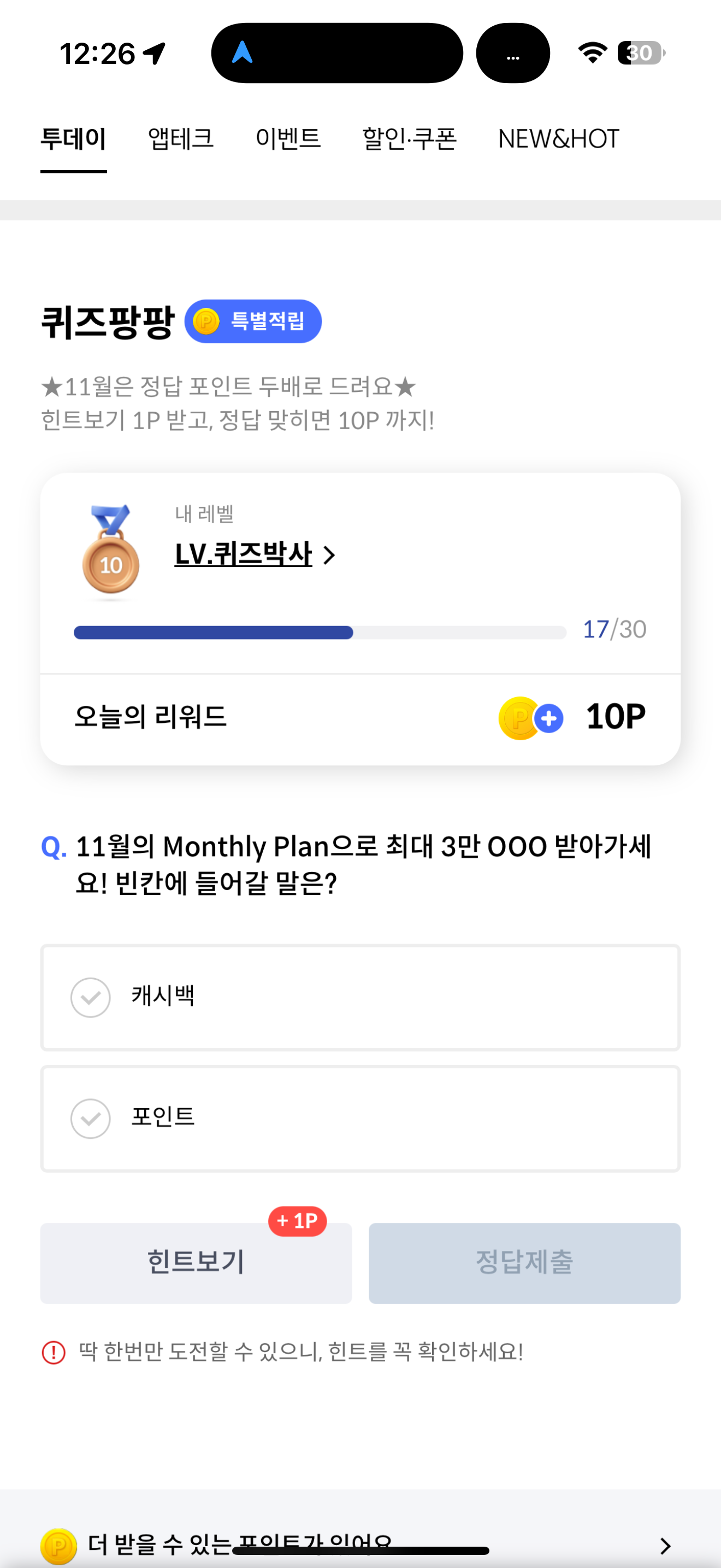 11월의 Monthly Plan으로 최대 3만 OOO 받아가세요! 빈칸에 들어갈 말은? 보기는 1. 캐시백 2. 포인트 입니다. 11월 이벤트로 무려 3만이나 제공합니다. 과연 캐시백일까요? 포인트일까요? 잘 참고해서 놓치지 말고 도전해 보세요.