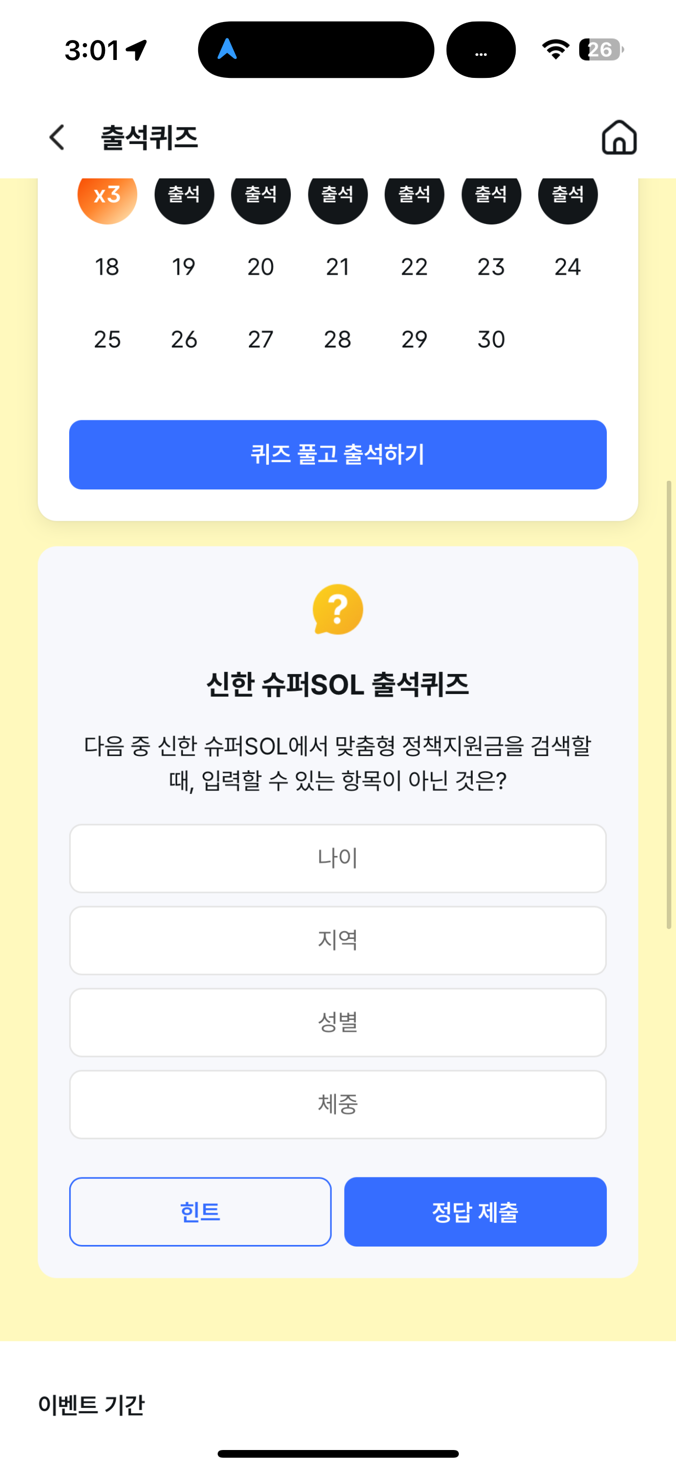 신한 슈퍼SOL 출석퀴즈 정답은 체중 입니다