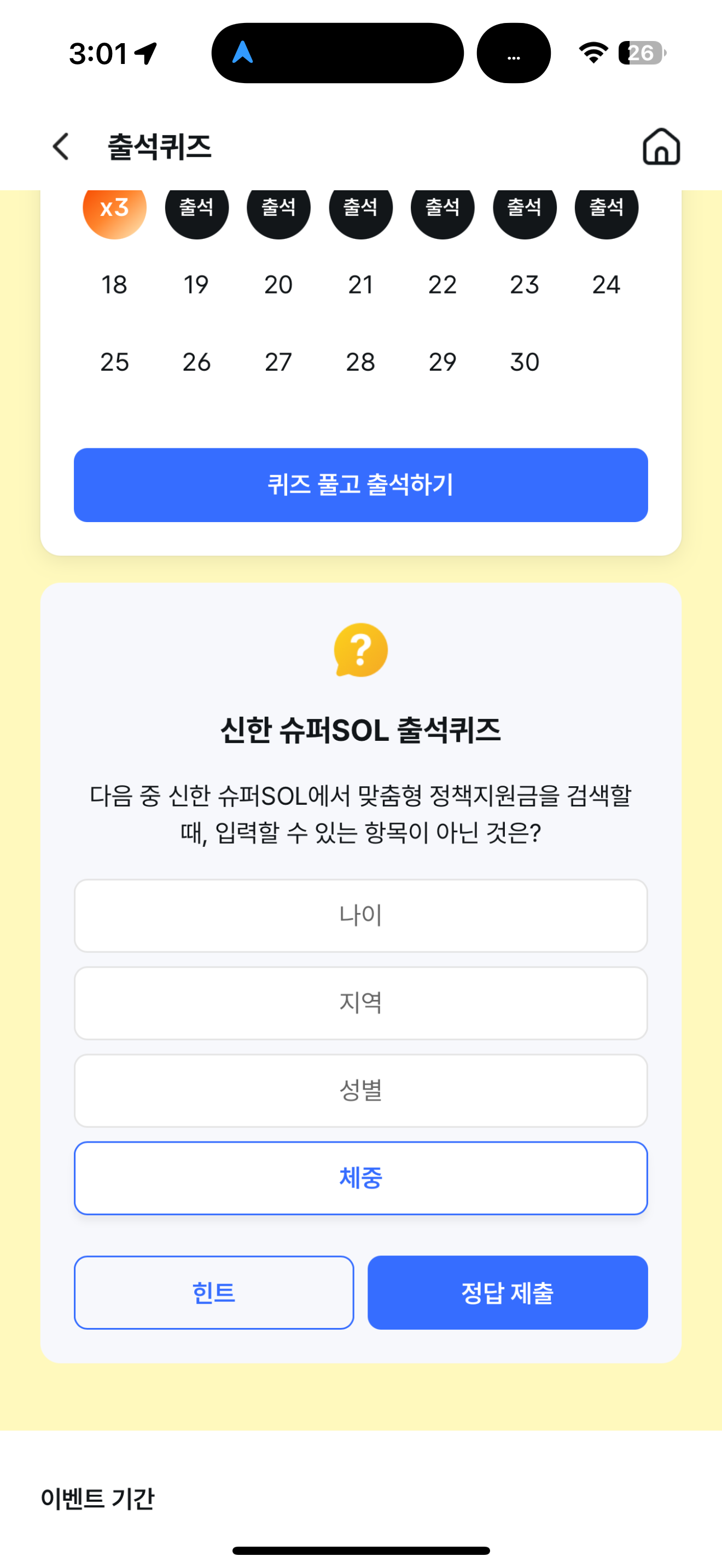 신한 슈퍼SOL 출석퀴즈 정답은 체중 입니다