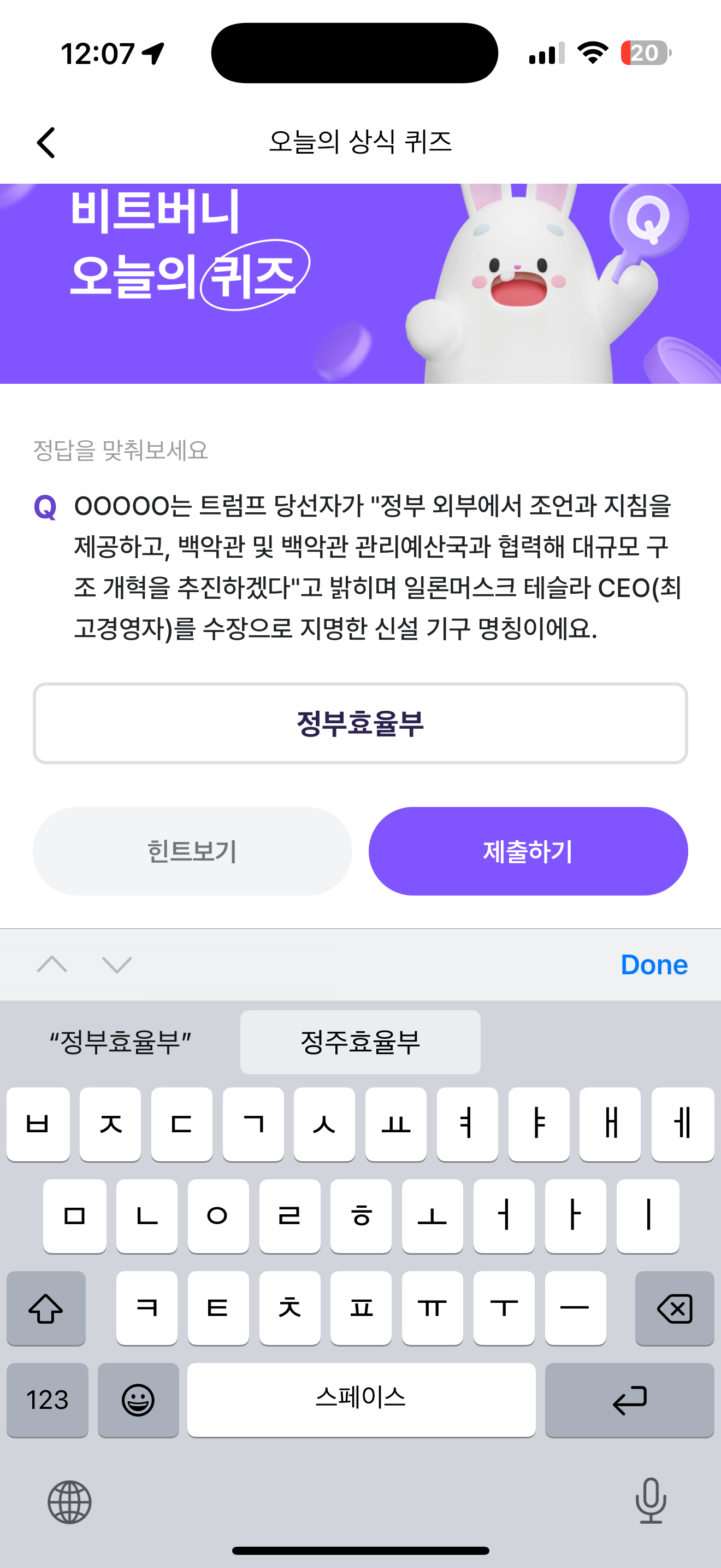 비트버니 오늘의 퀴즈 정답은 정부효율부 입니다