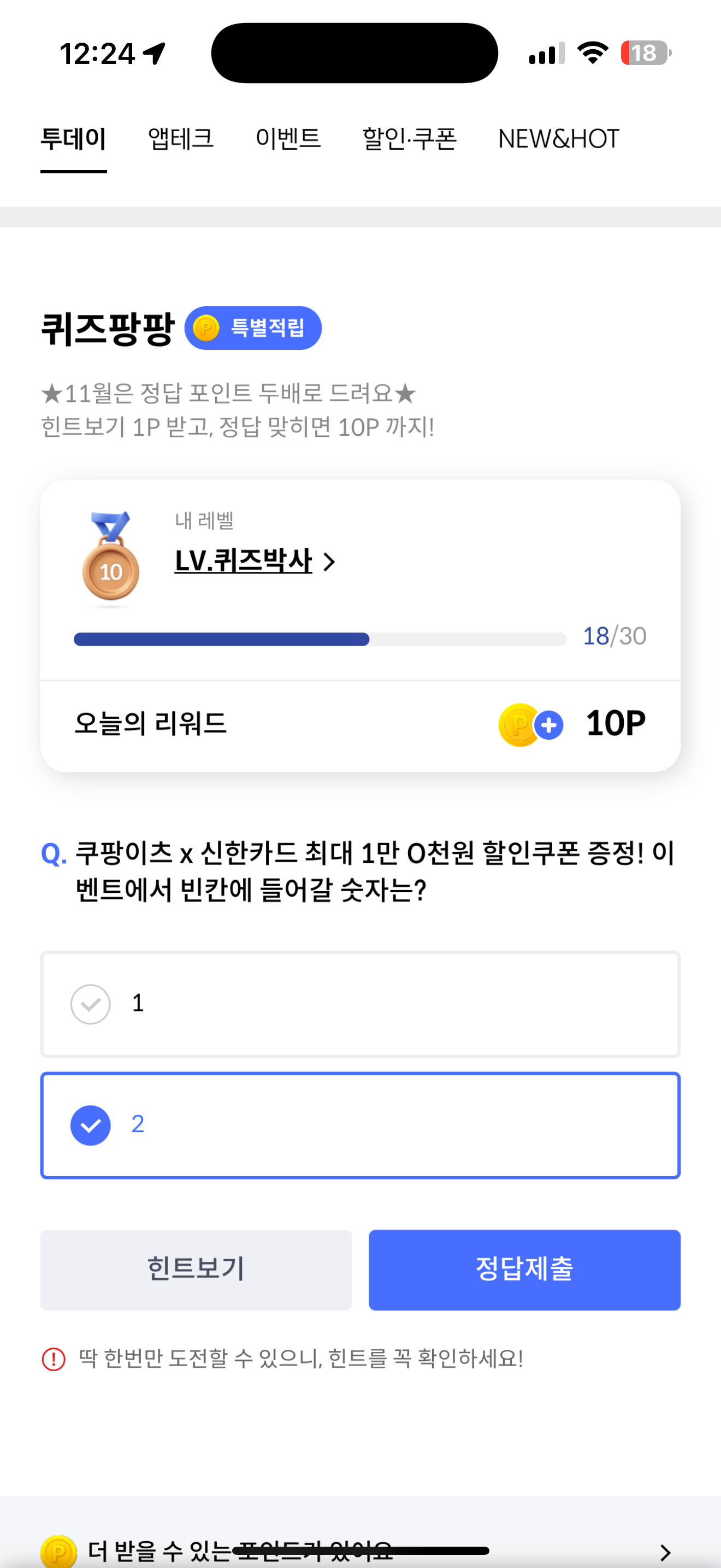 신한카드 퀴즈팡팡 정답은 2 입니다