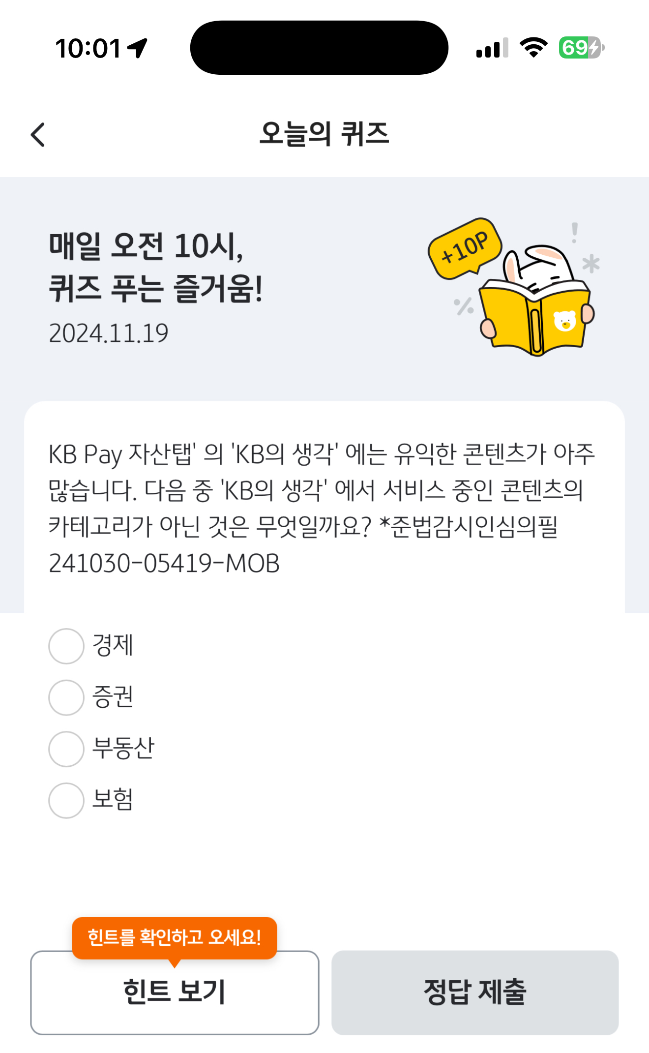 KB Pay 자산탭' 의 'KB의 생각' 에는 유익한 콘텐츠가 아주 많습니다. 다음 중 'KB의 생각' 에서 서비스 중인 콘텐츠의 카테고리가 아닌 것은 무엇일까요? *준법감시인심의필241030-05419-MOB 보기는 1. 경제 2. 증권 3. 부동산 4. 보험 입니다