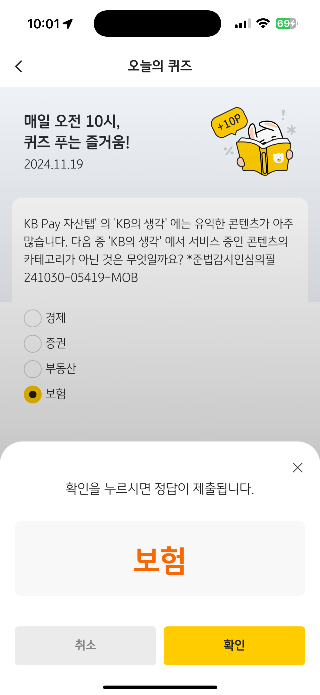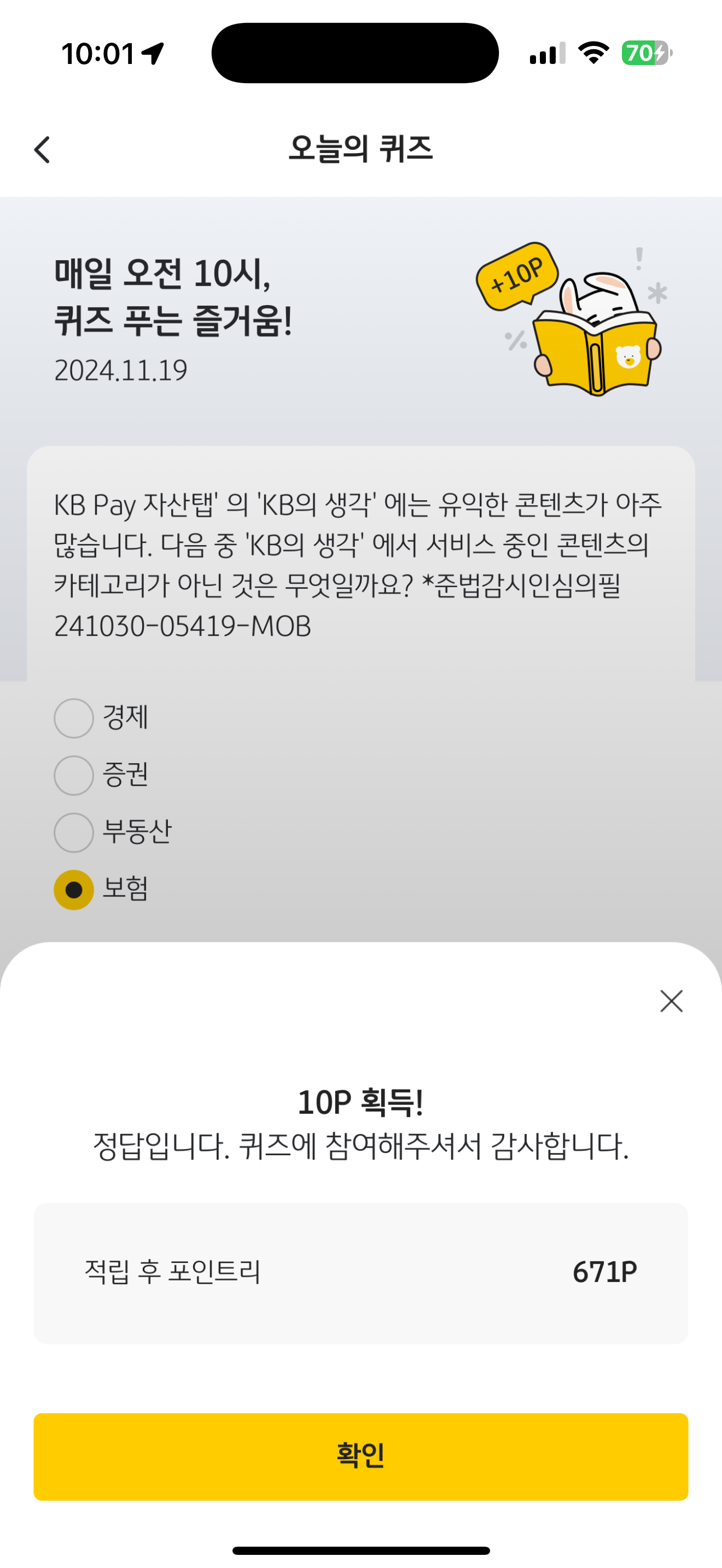 KB Pay 오늘의 퀴즈 정답은 보험 입니다