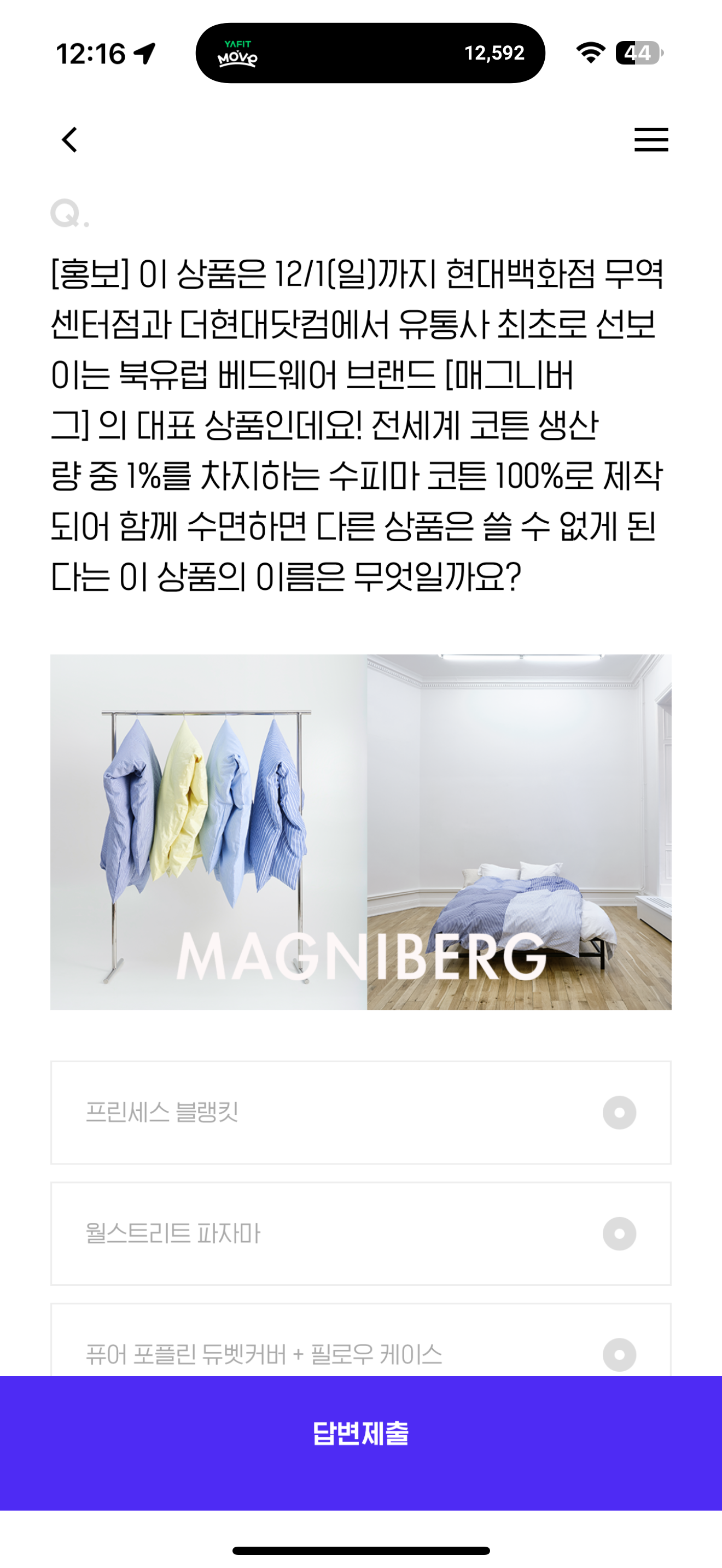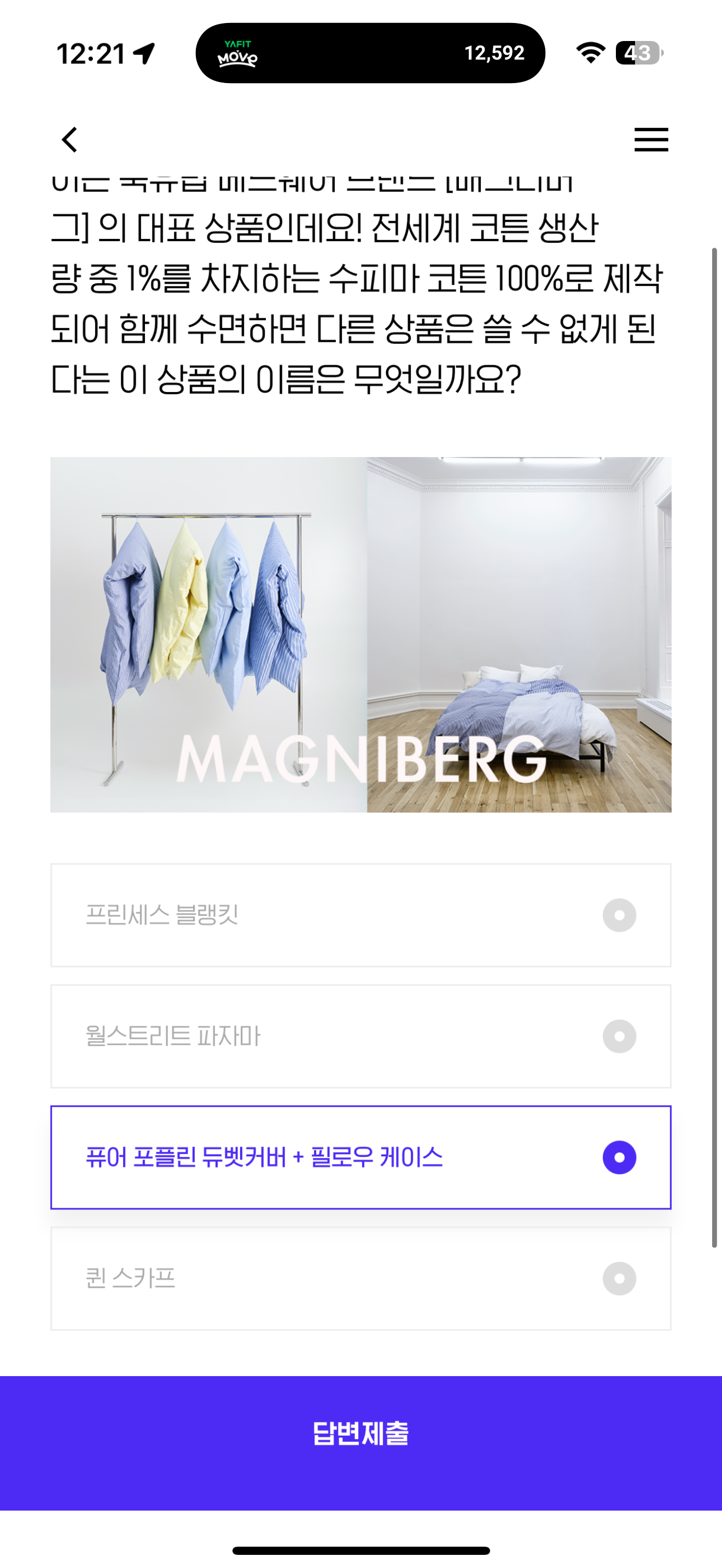 이 상품은 12/1(일)까지 현대백화점 무역센터점과 더현대닷컴에서 유통사 최초로 선보이는 북유럽 베드웨어 브랜드 [매그니버그] 의 대표 상품인데요! 전세계 코튼 생산량 중 1%를 차지하는 수피마 코튼 100%로 제작되어 함께 수면하면 다른 상품은 쓸 수 없게 된다는 이 상품의 이름은 무엇일까요? 보기는 1. 프린세스 블랭킷 2. 월스트리트 파자마 3. 퓨어 포플린 듀벳커버 + 필로우 케이스 4. 퀸 스카프