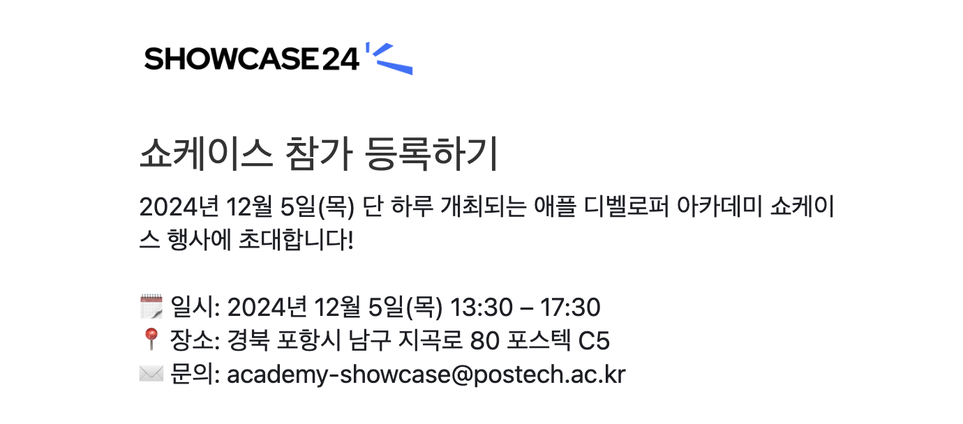 애플 디벨로퍼 아카데미 공식 홈페이지(https://developeracademy.postech.ac.kr/showcase24 )에 보면 자세한 내용을 확인할 수 있고 관련 문의 academy-showcase@postech.ac.kr를 통해 할 수 있습니다.