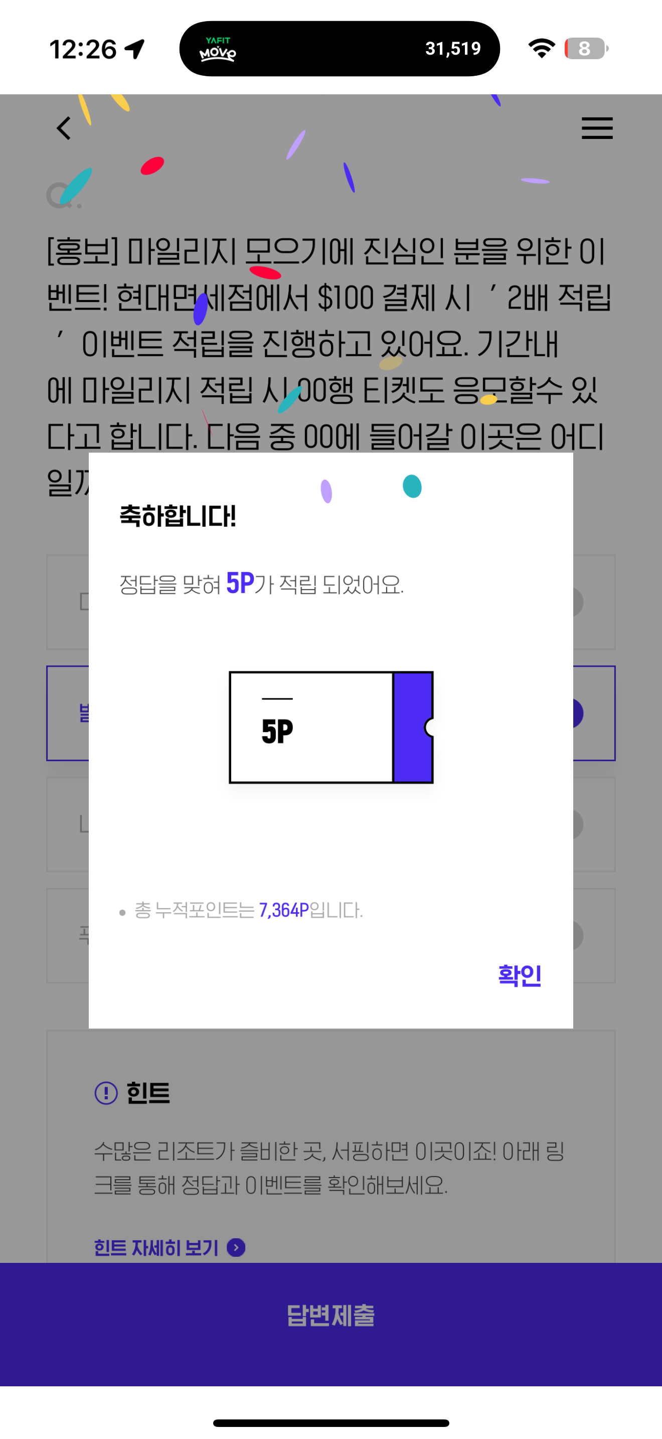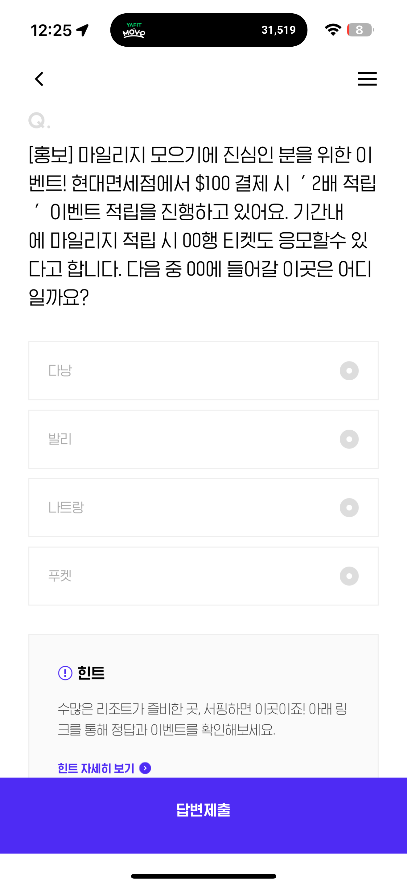 마일리지 모으기에 진심인 분을 위한 이벤트! 현대면세점에서 $100 결제 시 ' 2배 적립 ' 이벤트 적립을 진행하고 있어요. 기간내에 마일리지 적립 시 OO행 티켓도 응모할 수 있다고 합니다. 다음 중 OO에 들어갈 이곳은 어디일까요? 보기는 1. 다낭 2. 발리 3. 나트랑 4. 푸켓 입니다