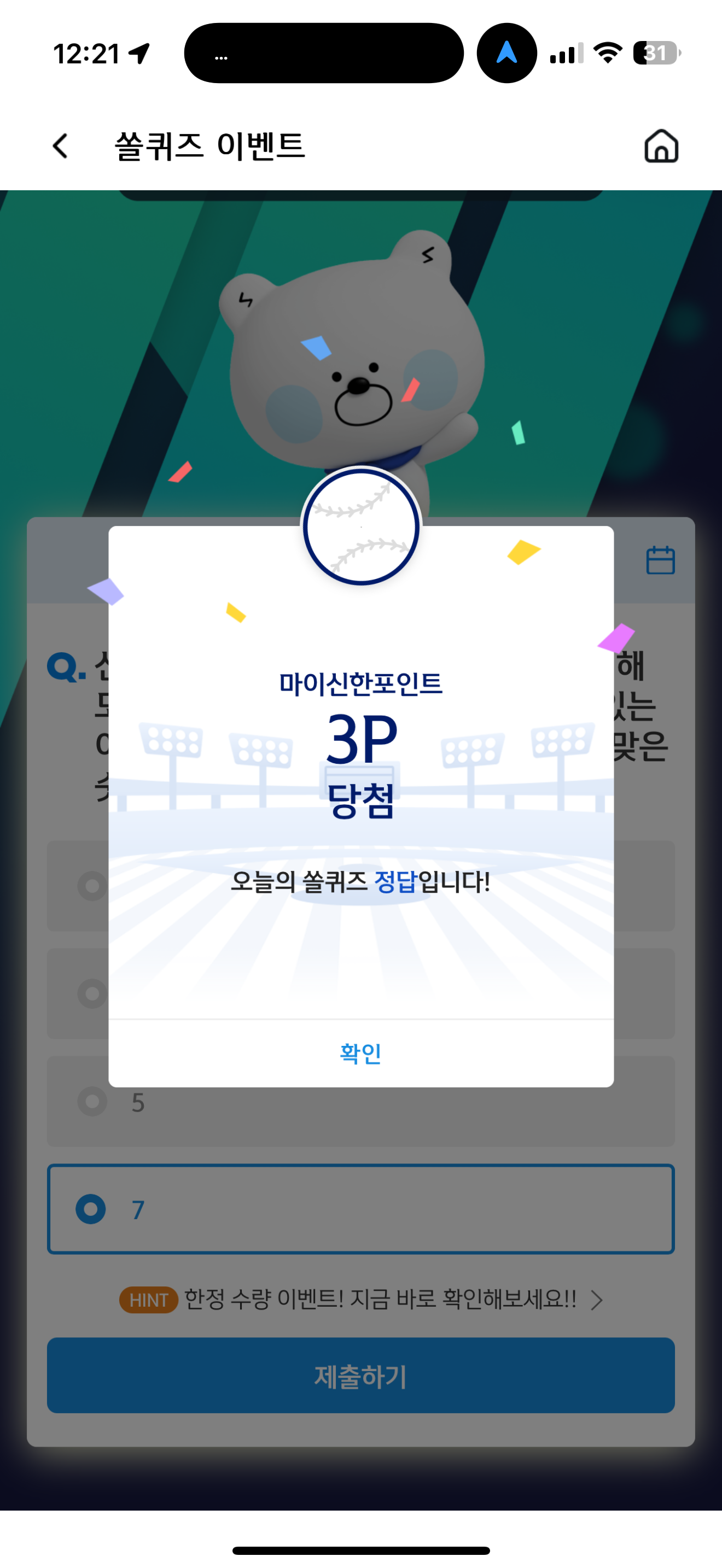 신한 슈퍼SOL 야구/상식 쏠퀴즈 정답은 7 입니다