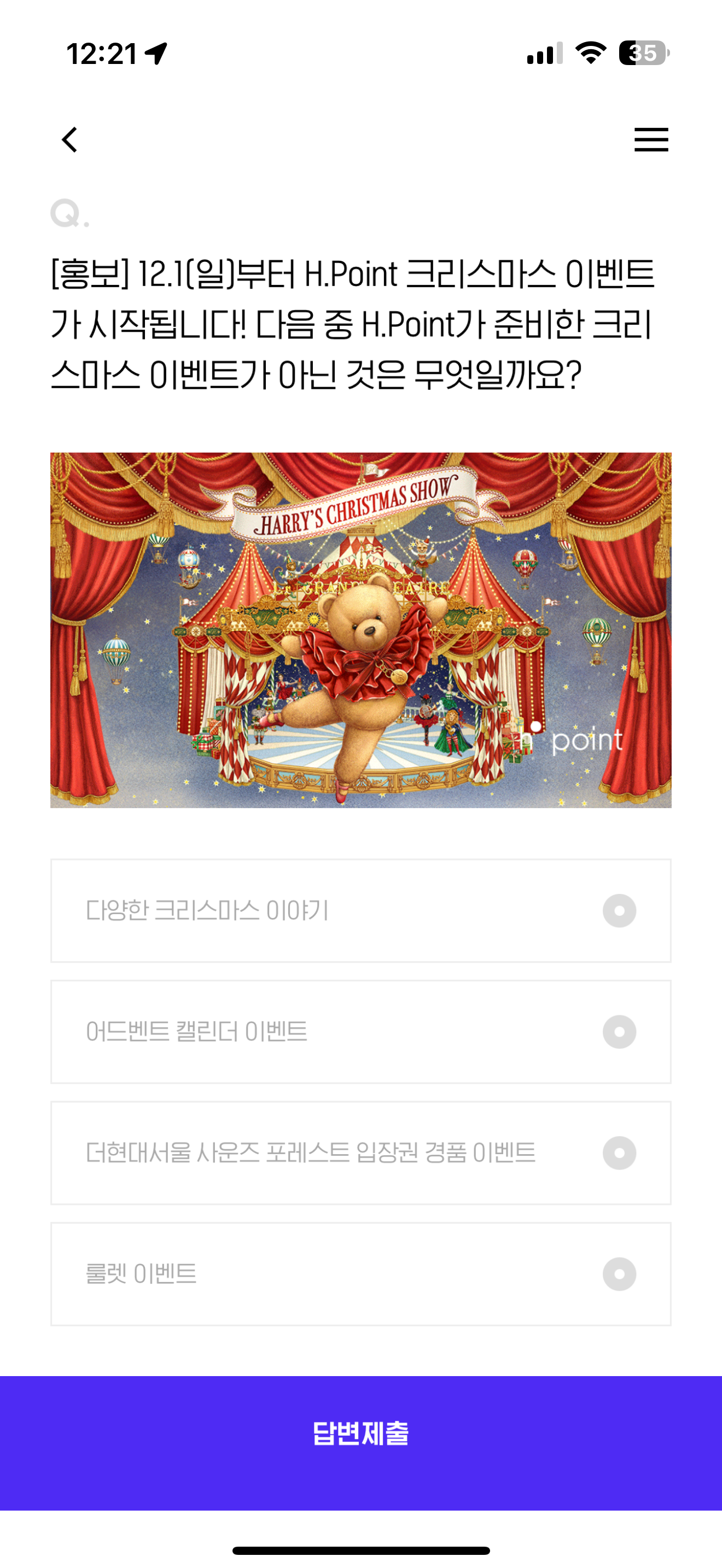 12.1(일)부터 H.Point 크리스마스 이벤트가 시작됩니다! 다음 중 H.Point가 준비한 크리스마스 이벤트가 아닌 것은 무엇일까요? 보기는 1. 다양한 크리스마스 이야기 2. 어드벤트 캘린더 이벤트 3. 더현대서울 사운즈 포레스트 입장권 경품 이벤트 4. 룰렛 이벤트 입니다