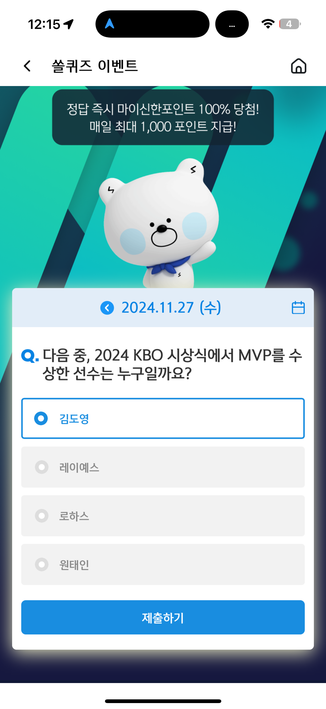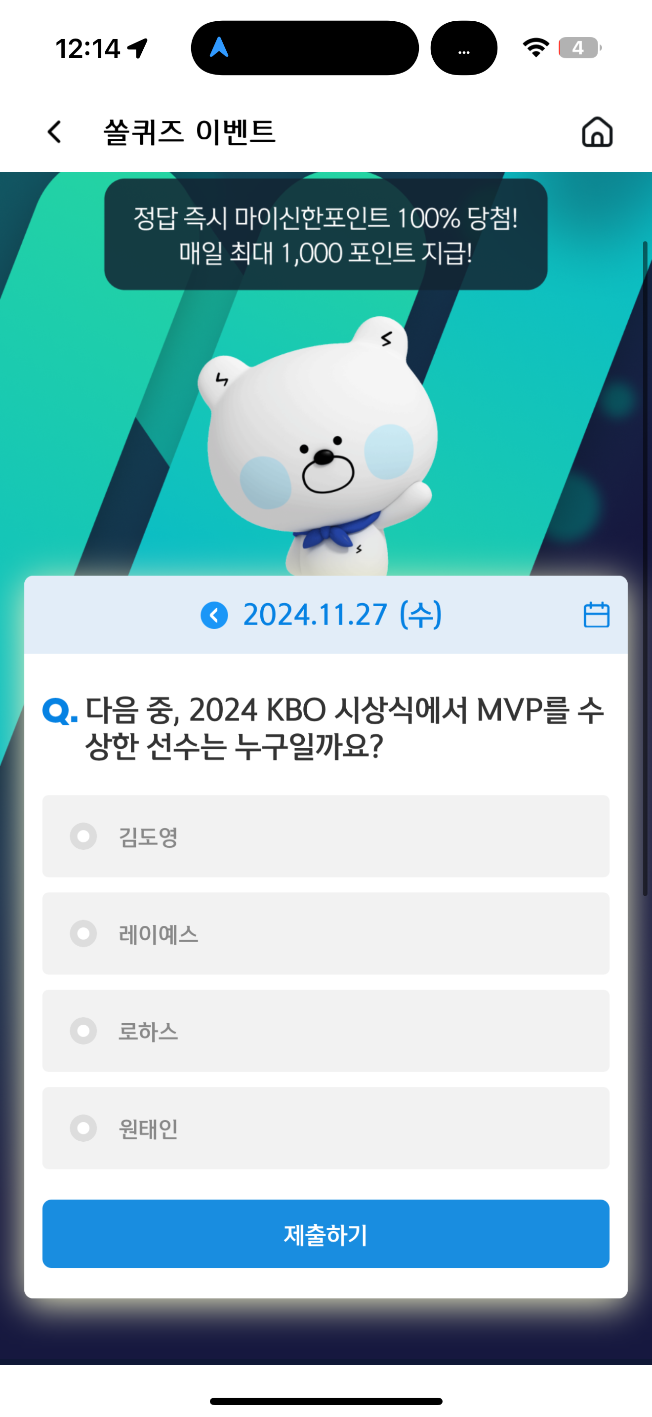 신한 슈퍼SOL 야구/상식 쏠퀴즈 11월 27일 문제입니다