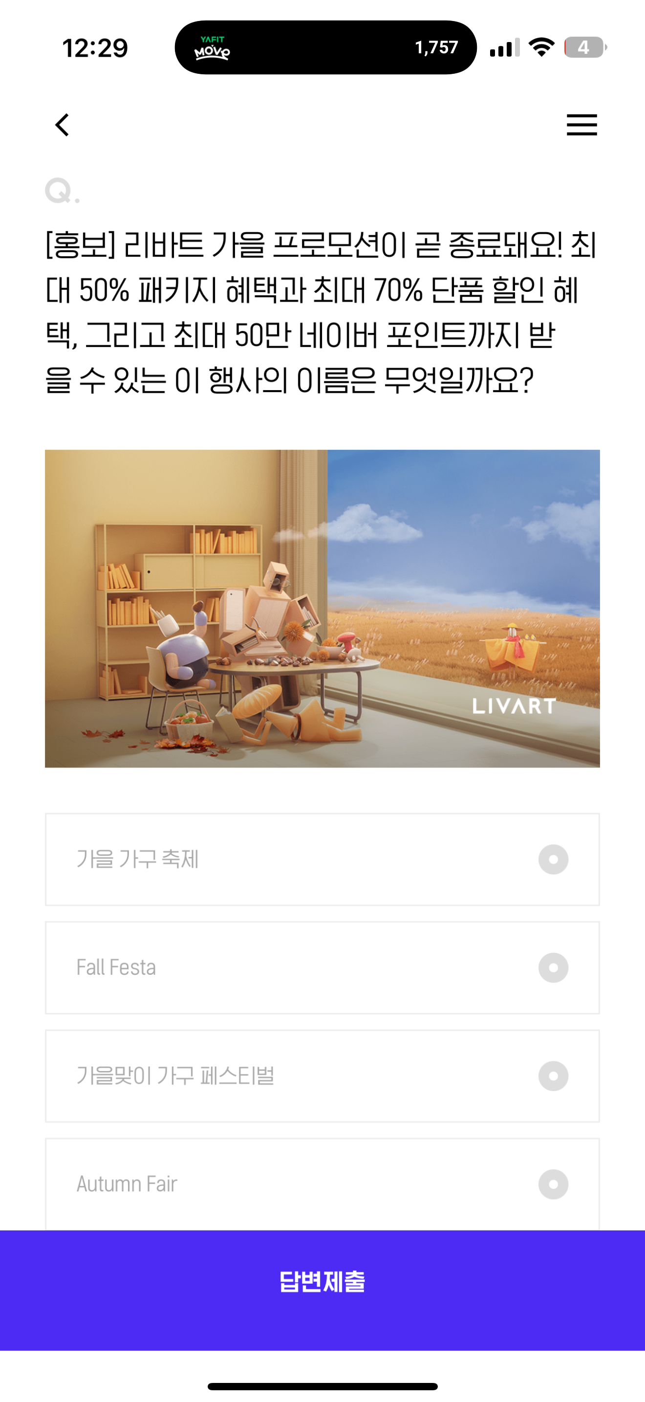 리바트 가을 프로모션이 곧 종료돼요! 최대 50% 패키지 혜택과 최대 70% 단품 할인 혜택, 그리고 최대 50만 네이버 포인트까지 받을 수 있는 이 행사의 이름은 무엇일까요? 보기는 1. 가을 가구 축제 2. Fall Festa 3. 가을맞이 가구 페스티벌 4. Autumn Fair 입니다