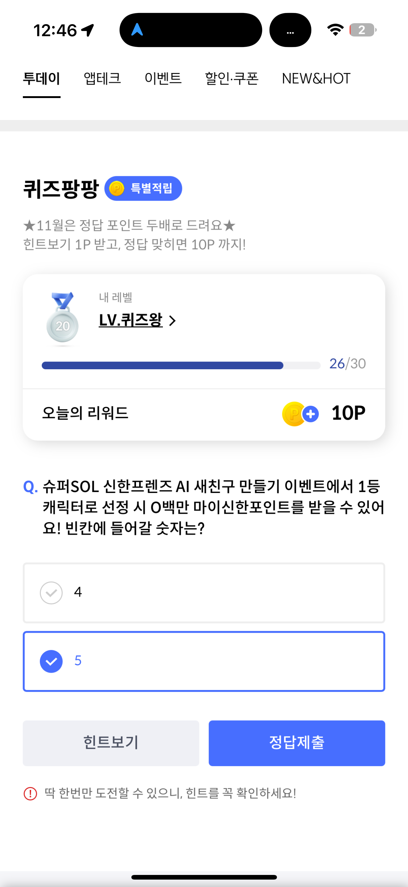 신한카드 퀴즈팡팡 정답은 5 입니다