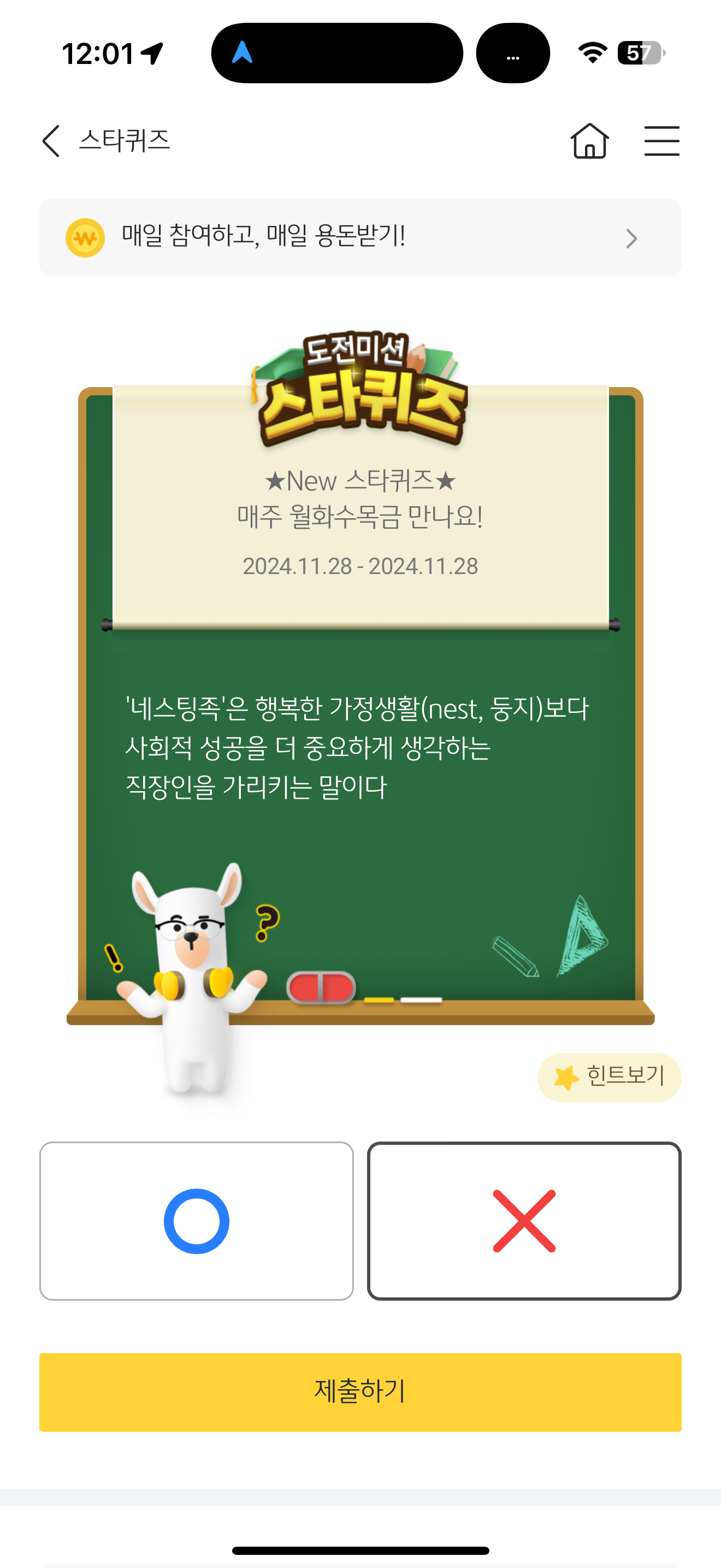 '네스팅족'은 행복한 가정생활(nest, 둥지)보다 사회적 성공을 더 중요하게 생각하는 직장인을 가리키는 말이다 O, X 퀴즈인데요. 요즘 네스팅족들이 많이 늘어나고 있다고 합니다. 네스트는 둥지를 의미하는데 가정보다 사회적 성공을 더 중요시 할까요? 우리나라에는 가정보다 성공을 중요시하는 사람들이 많은데 그럴까요?