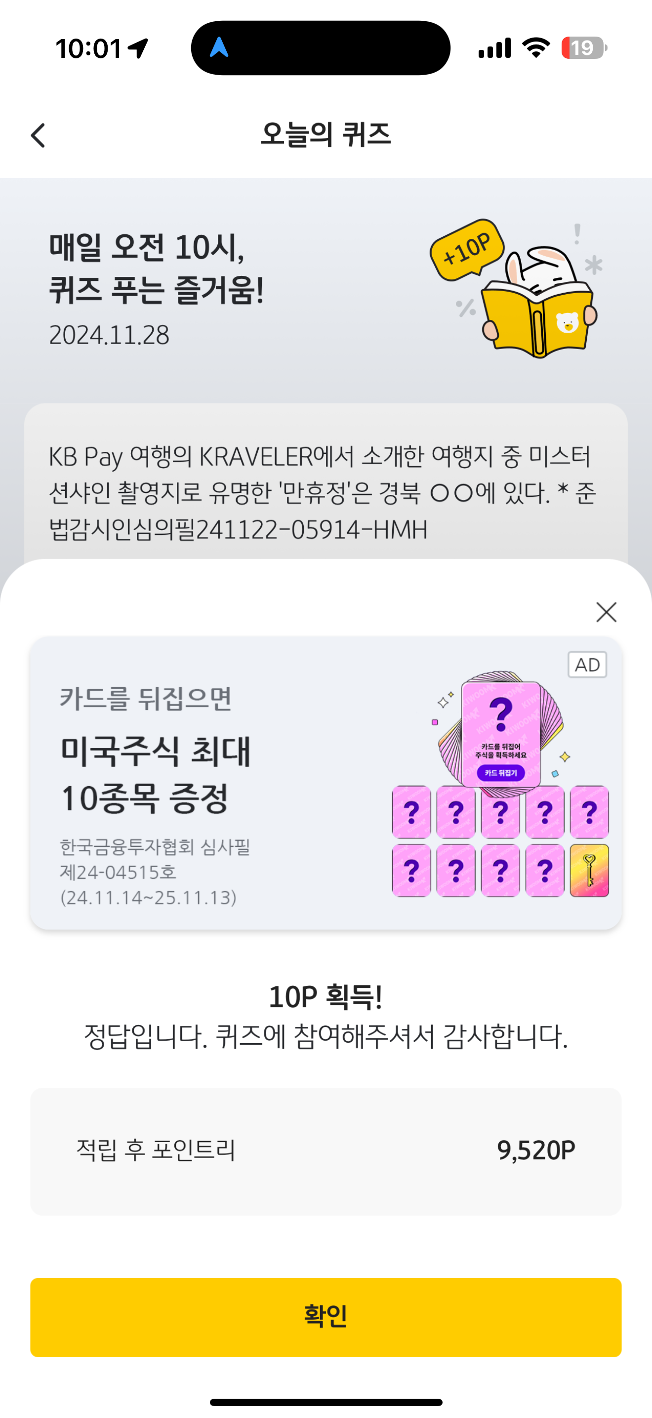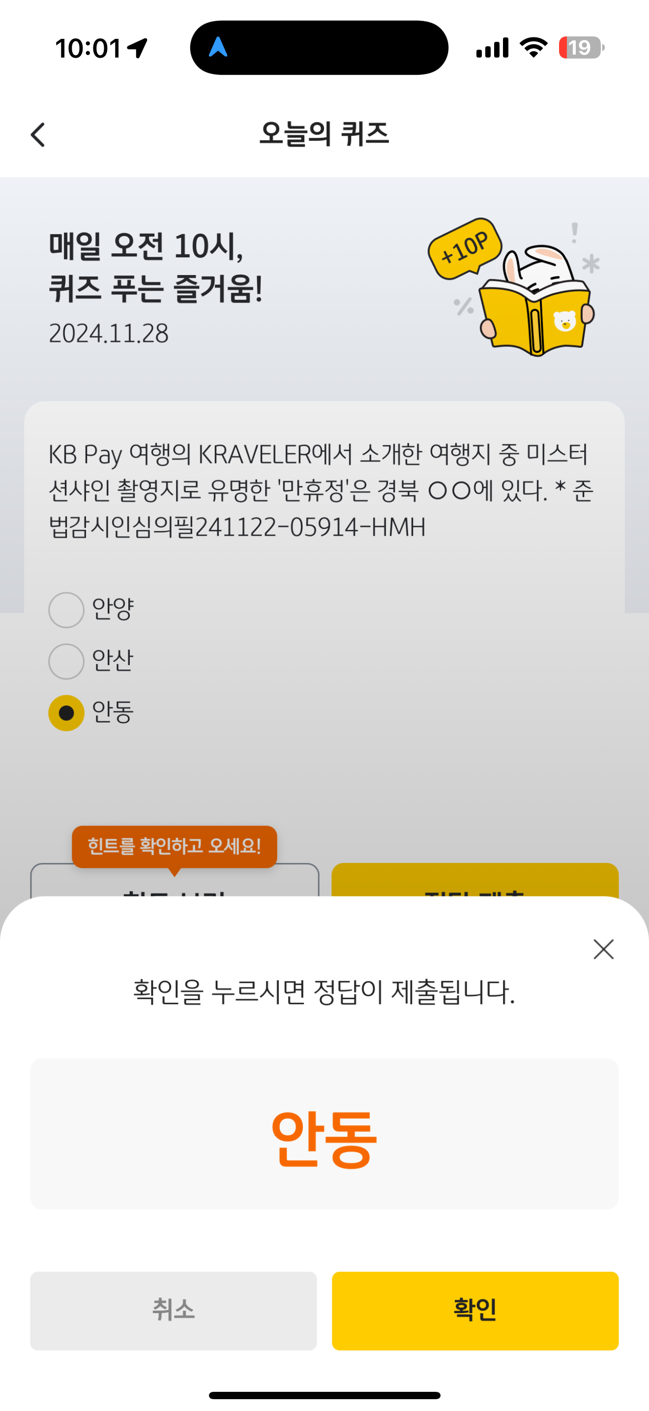 KB Pay 오늘의 퀴즈 정답은 안동 입니다