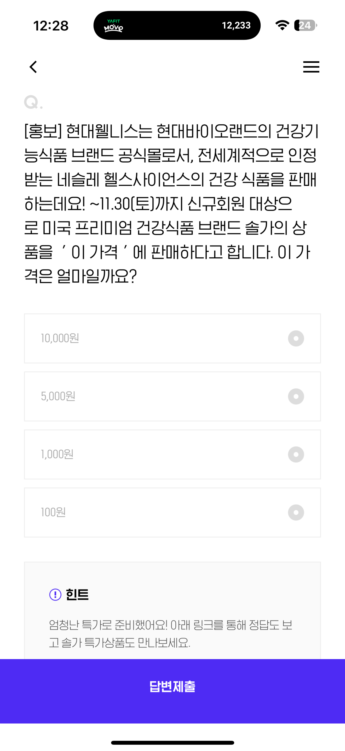 현대웰니스는 현대바이오랜드의 건강기능식품 브랜드 공식몰로서, 전세계적으로 인정받는 네슬레 헬스사이언스의 건강 식품을 판매 하는데요! ~11.30(토)까지 신규회원 대상으로 미국 프리미엄 건강식품 브랜드 솔가의 상품을 ' 이 가격 ' 에 판매하다고 합니다. 이 가격은 얼마일까요? 보기는 1. 10,000원 2. 5,000원 3. 1,000원 4. 100원 입니다