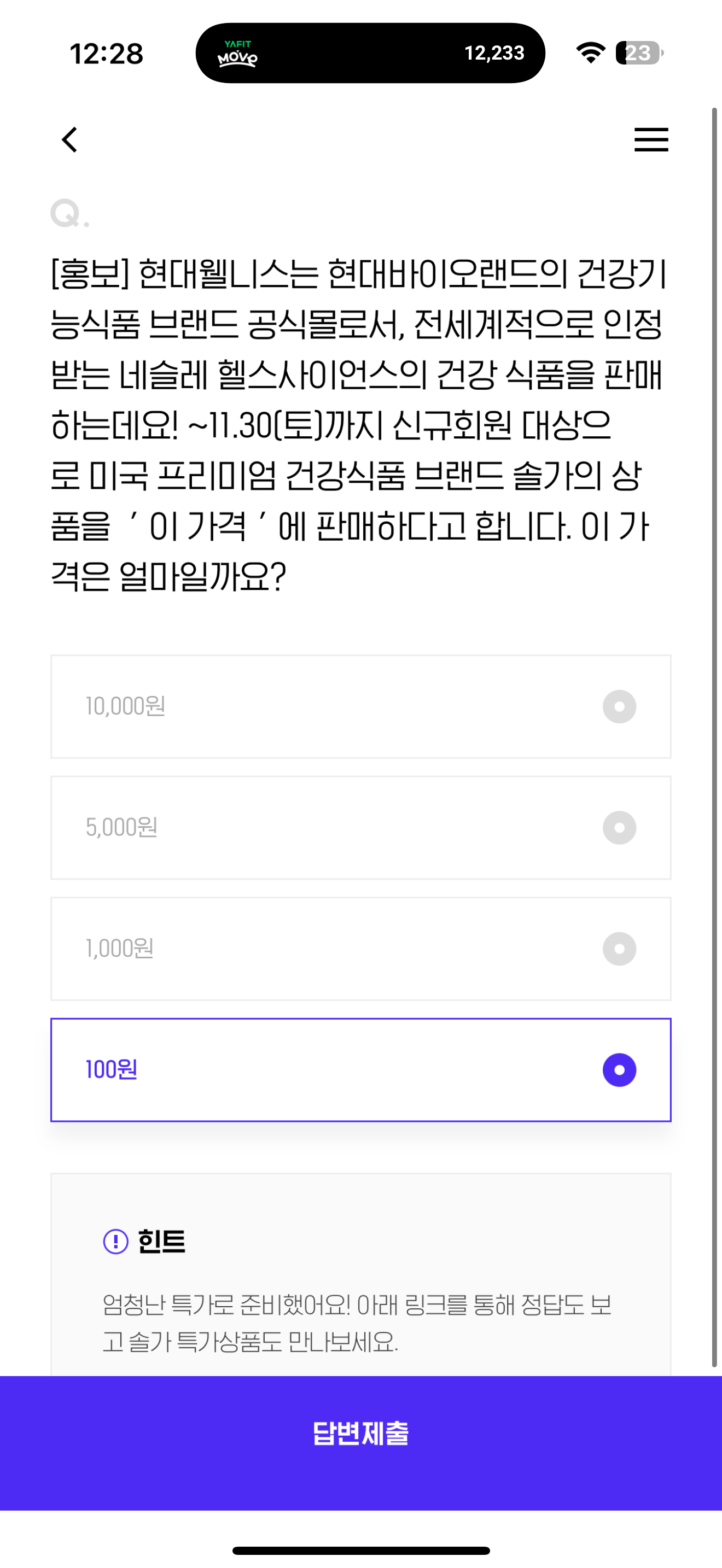 H포인트 퀴즈 정답은 100원 입니다