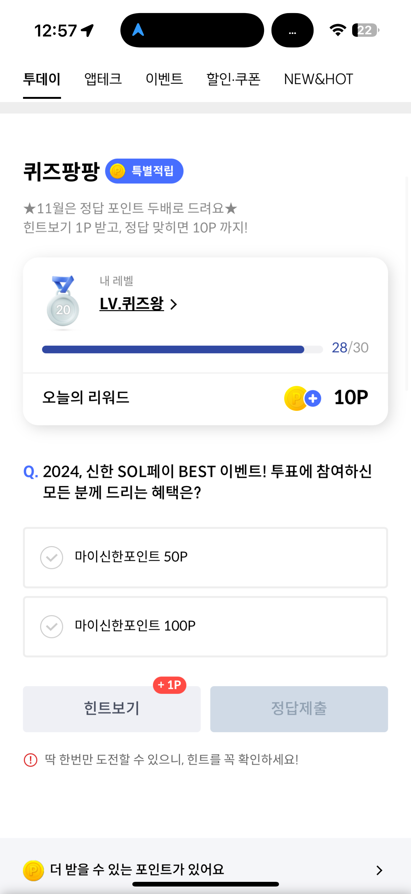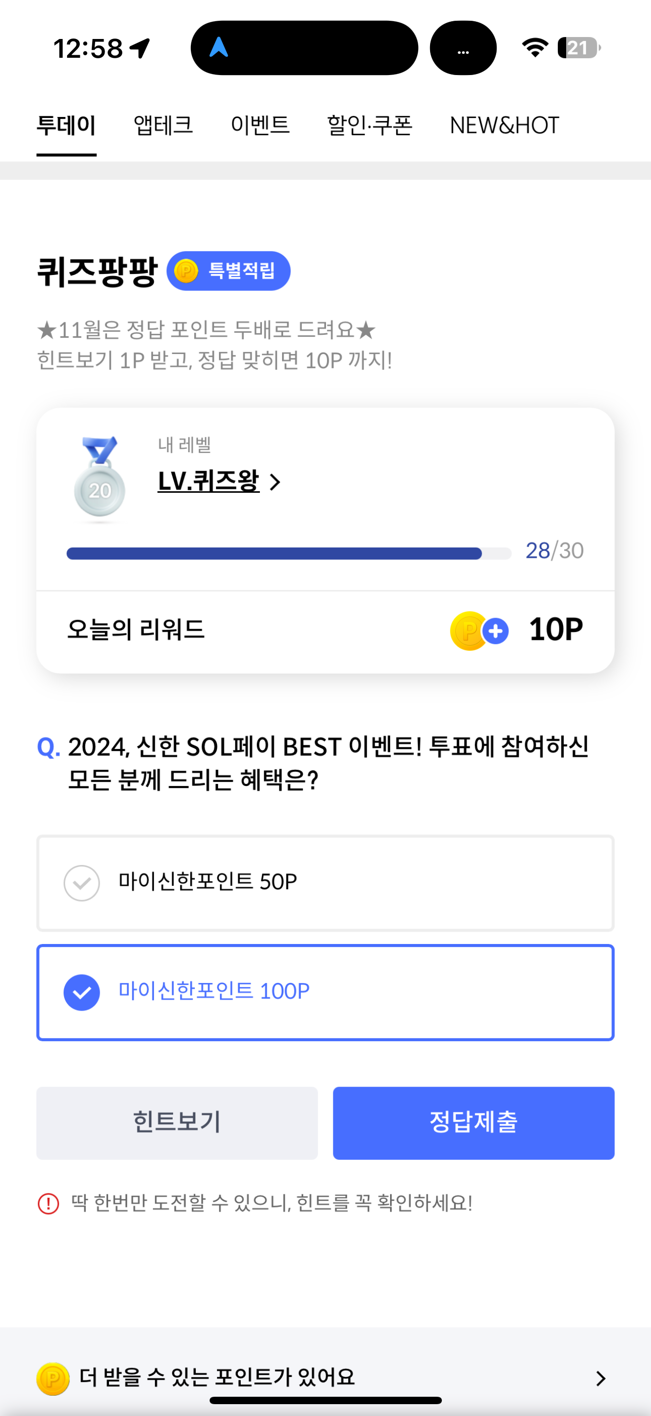 신한카드 퀴즈팡팡 정답은 마이신한포인트 100P 입니다
