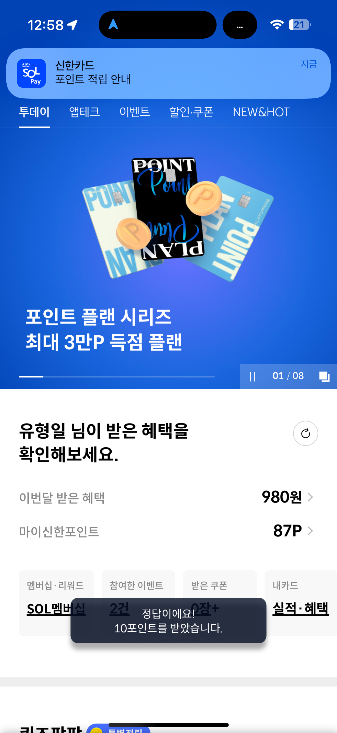 신한카드 퀴즈팡팡 정답은 마이신한포인트 100P 입니다