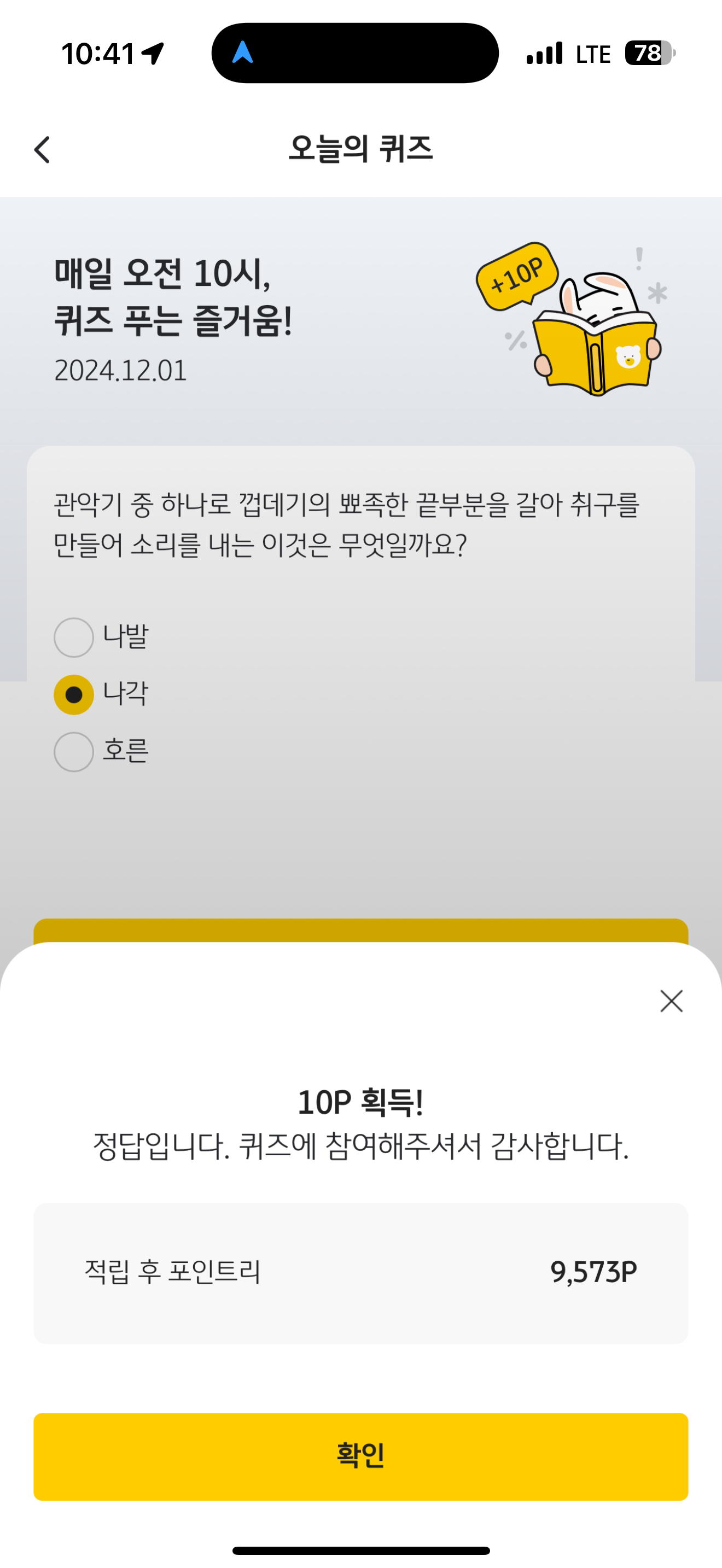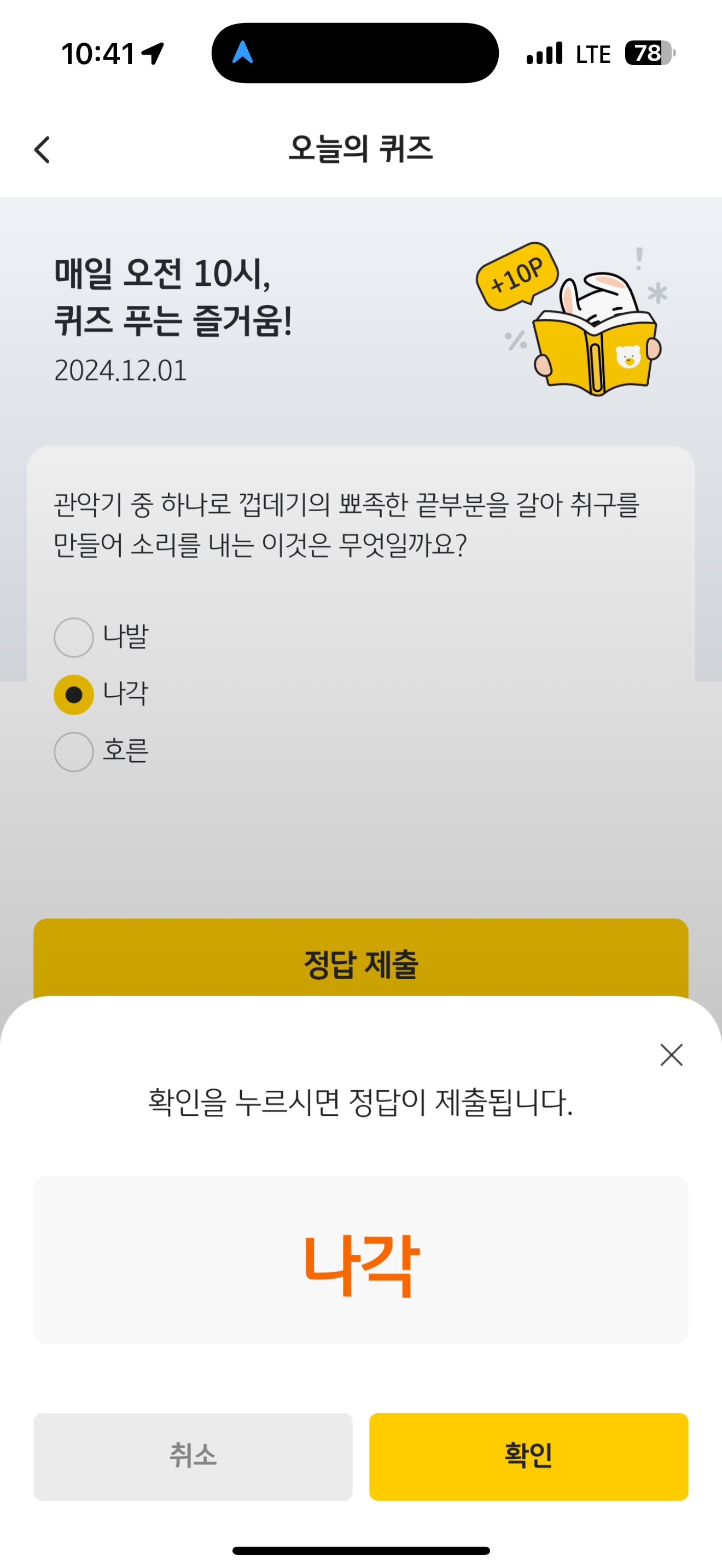 KB Pay 오늘의 퀴즈 정답은 나각 입니다