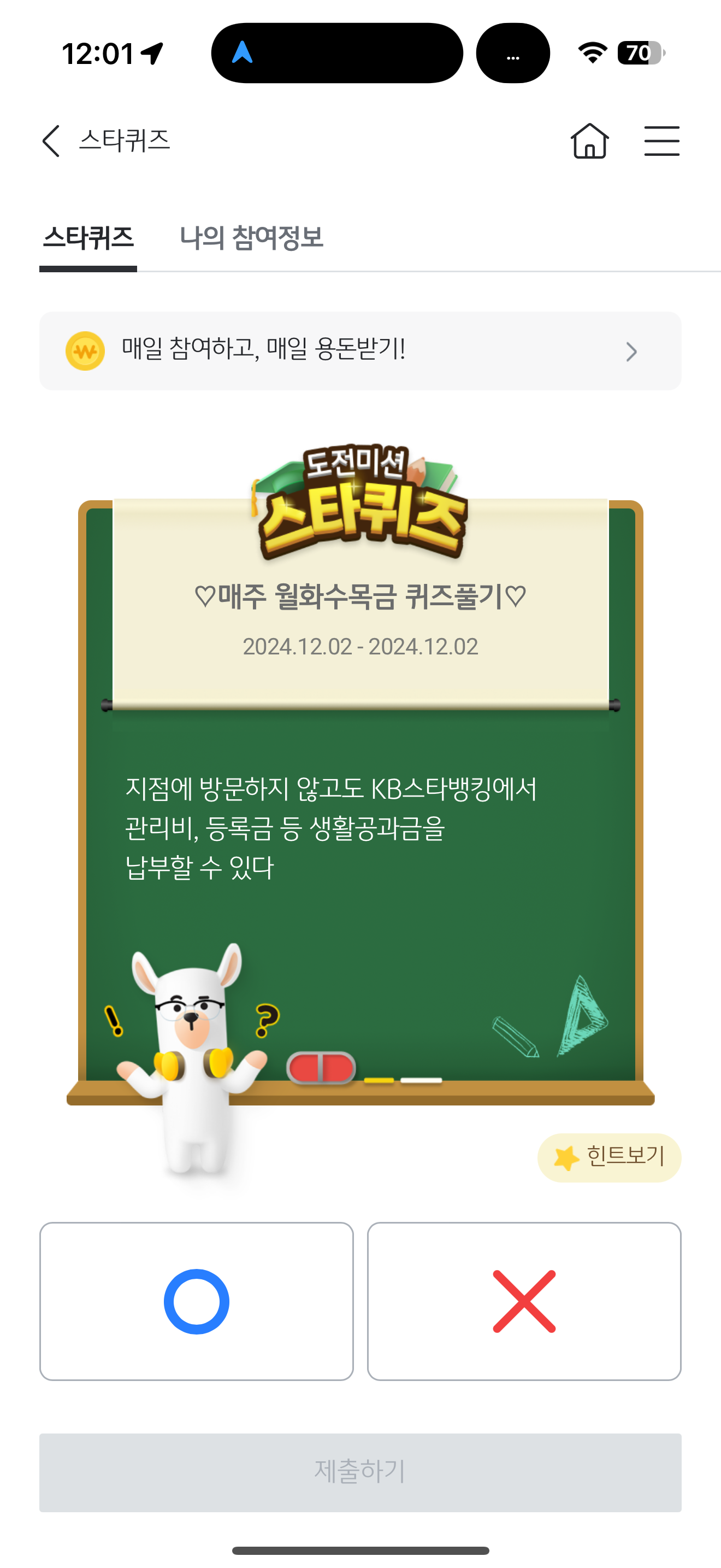 KB스타뱅킹 스타퀴즈 정답은 O 입니다