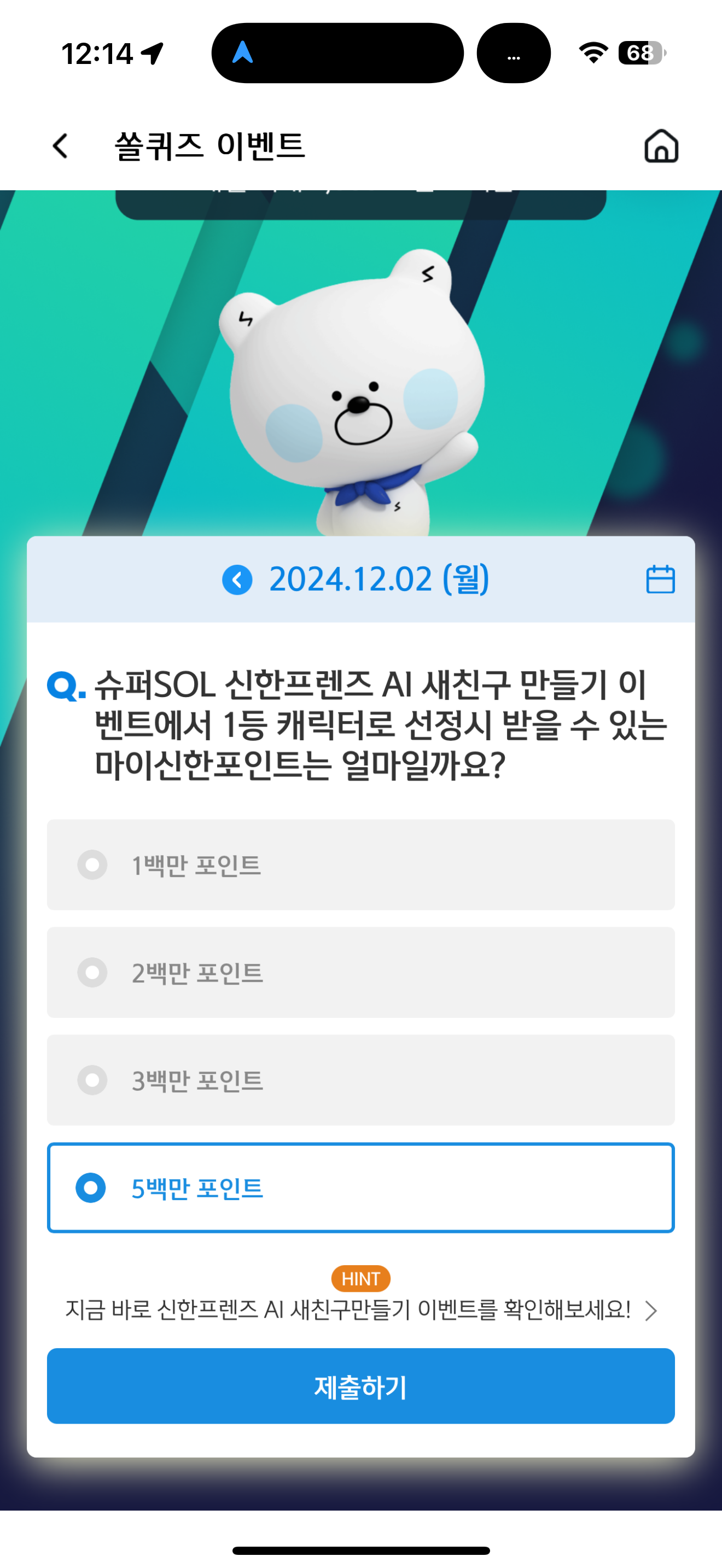 슈퍼SOL 신한프렌즈 AI 새친구 만들기 이벤트에서 1등 캐릭터로 선정시 받을 수 있는 마이신한포인트는 얼마일까요? 보기는 1. 1백만 포인트 2. 2백만 포인트 3. 3백만 포인트 4. 5백만 포인트 입니다. 1등 캐릭터로 선정되면 정말 파격적인 헤택을 받게 되는데요. 참고해 보세요