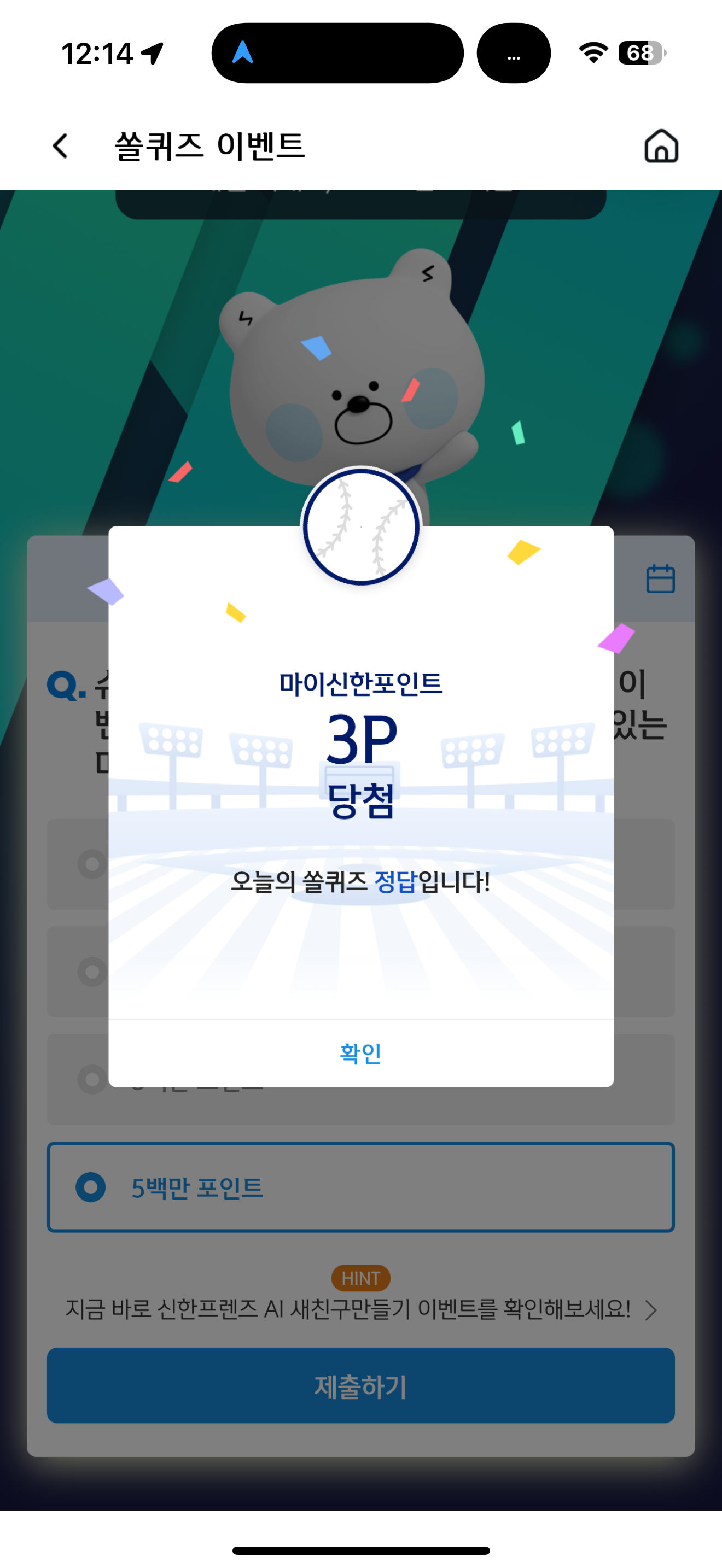 신한 슈퍼SOL 야구/상식 쏠퀴즈 정답은 5백만 포인트 입니다