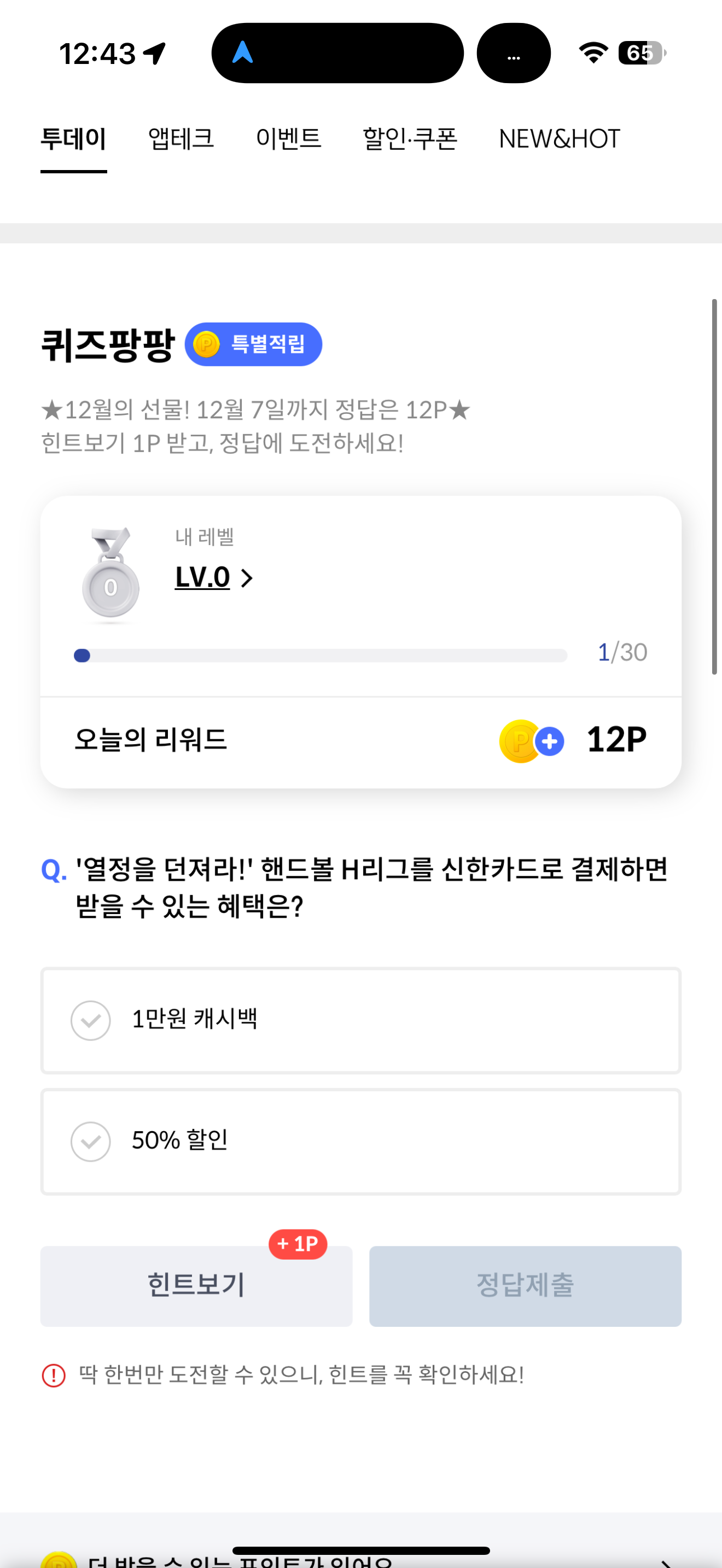 신한카드 퀴즈팡팡 정답은 50% 할인 입니다