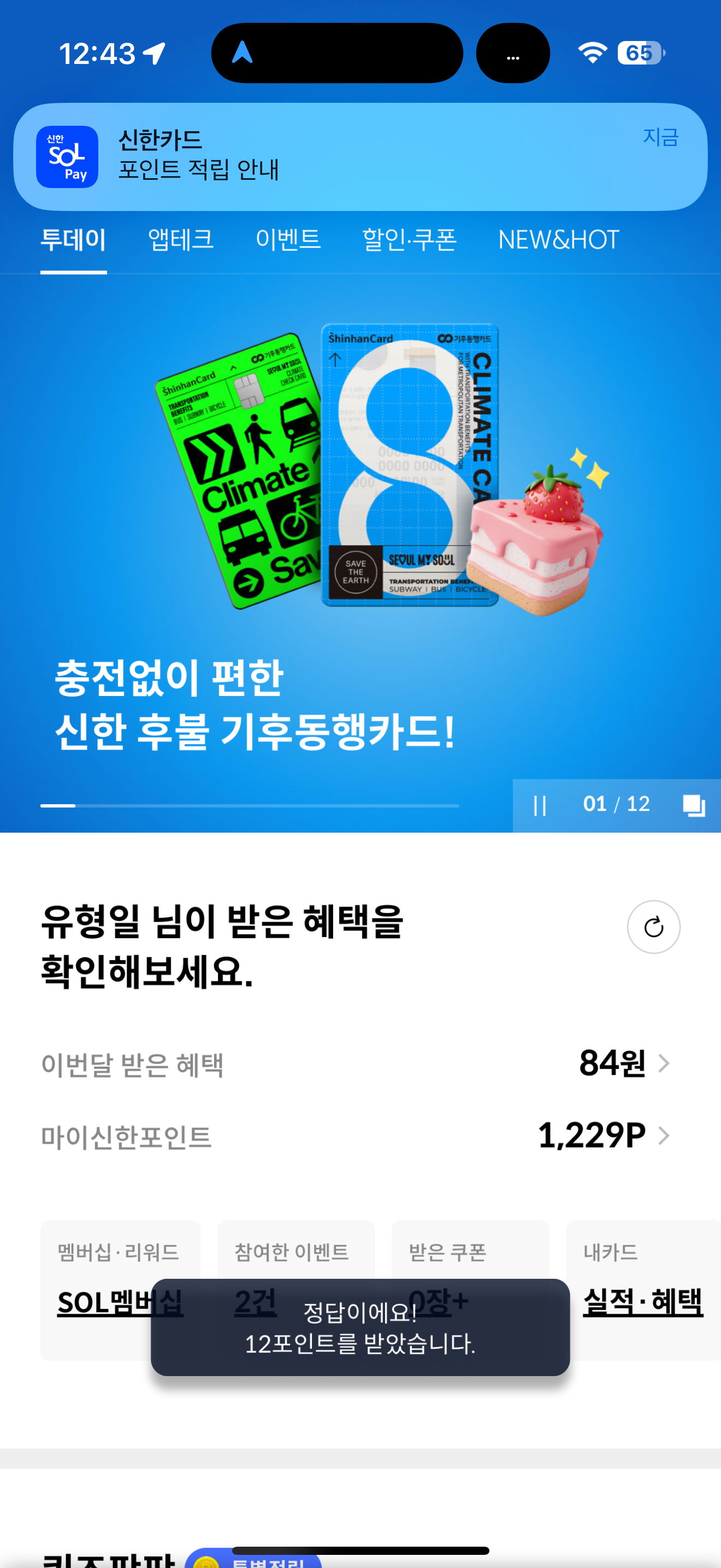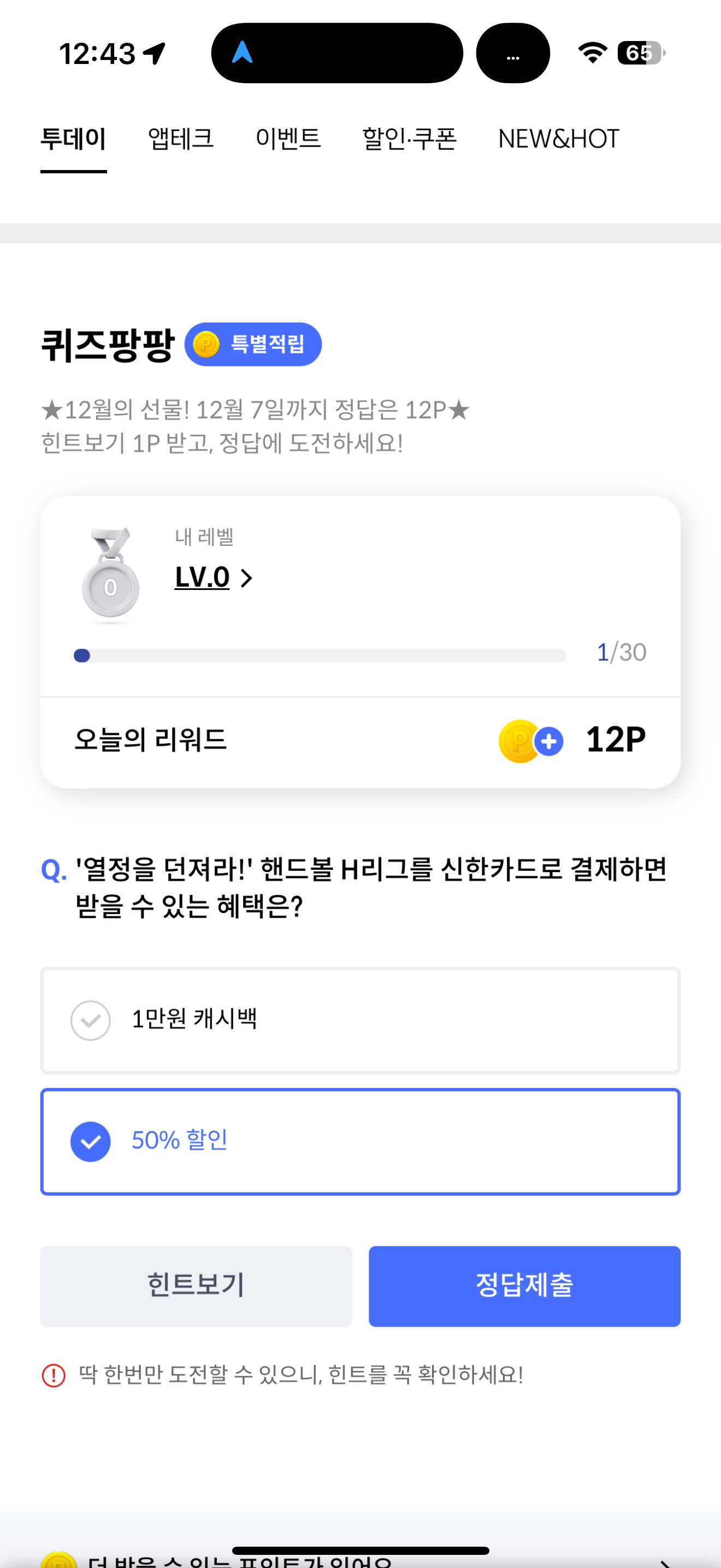 신한카드 퀴즈팡팡 정답은 50% 할인 입니다
