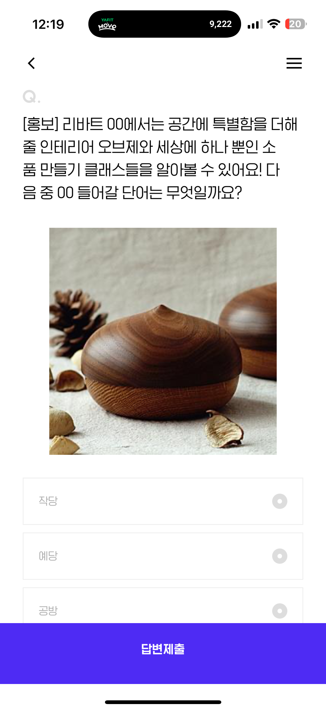 리바트 OO에서는 공간에 특별함을 더해줄 인테리어 오브제와 세상에 하나 뿐인 소품 만들기 클래스들을 알아볼 수 있어요! 다음 중 OO 들어갈 단어는 무엇일까요? 보기는 1. 작당 2. 예당 3. 공방 4. 공장 입니다. 공예를 하는 곳을 우리는 흔히 여기로 부르죠. 쉽습니다.