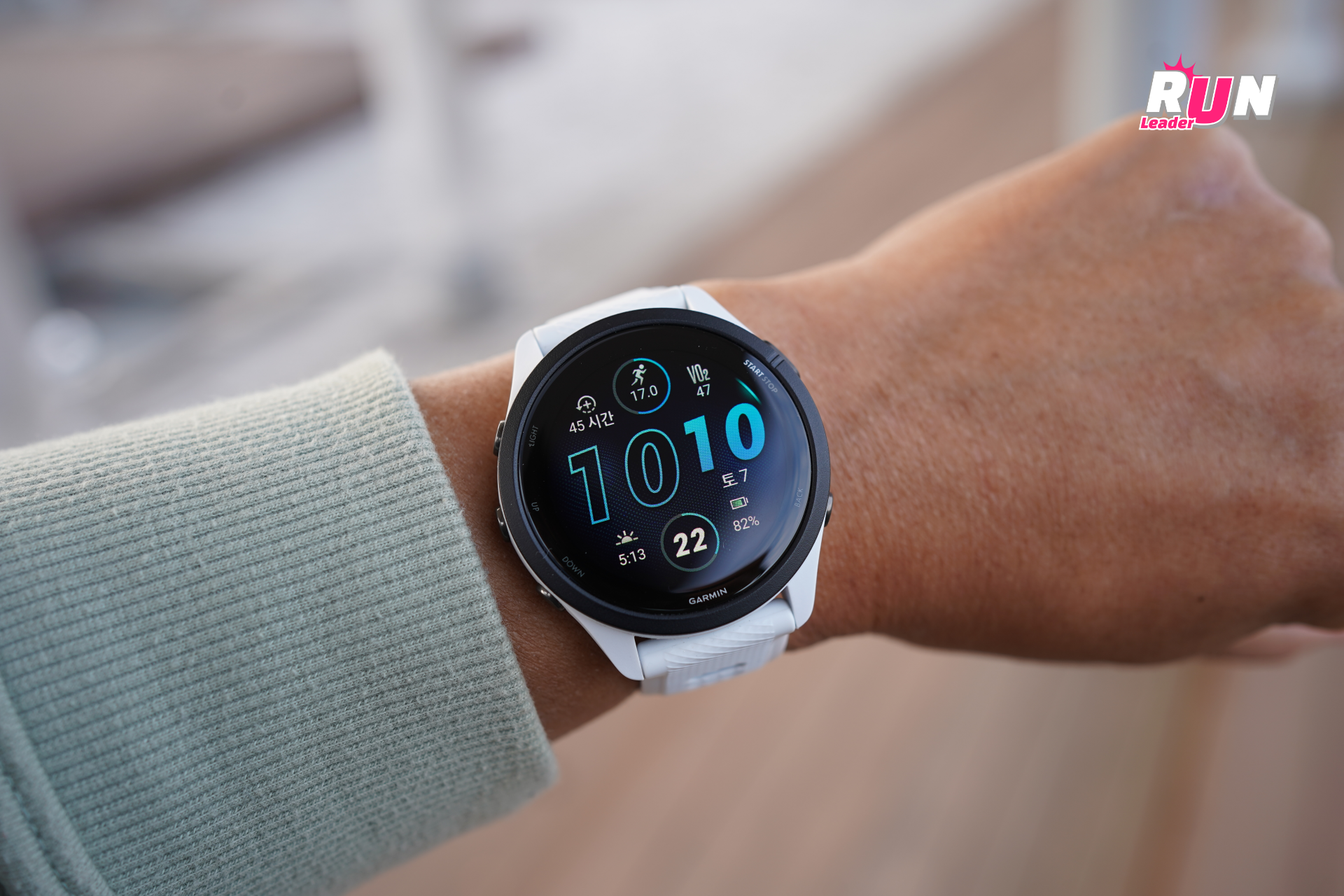 가민 포러너 265는 아날로그 원형 시계 디자인을 가지고 있고 1.3인치 AMOLED 디스플레이로 되어 있습니다. 그리고 416 x 416 해상도로 선명하고 쨍한 화면을 느낄 수 있습니다.