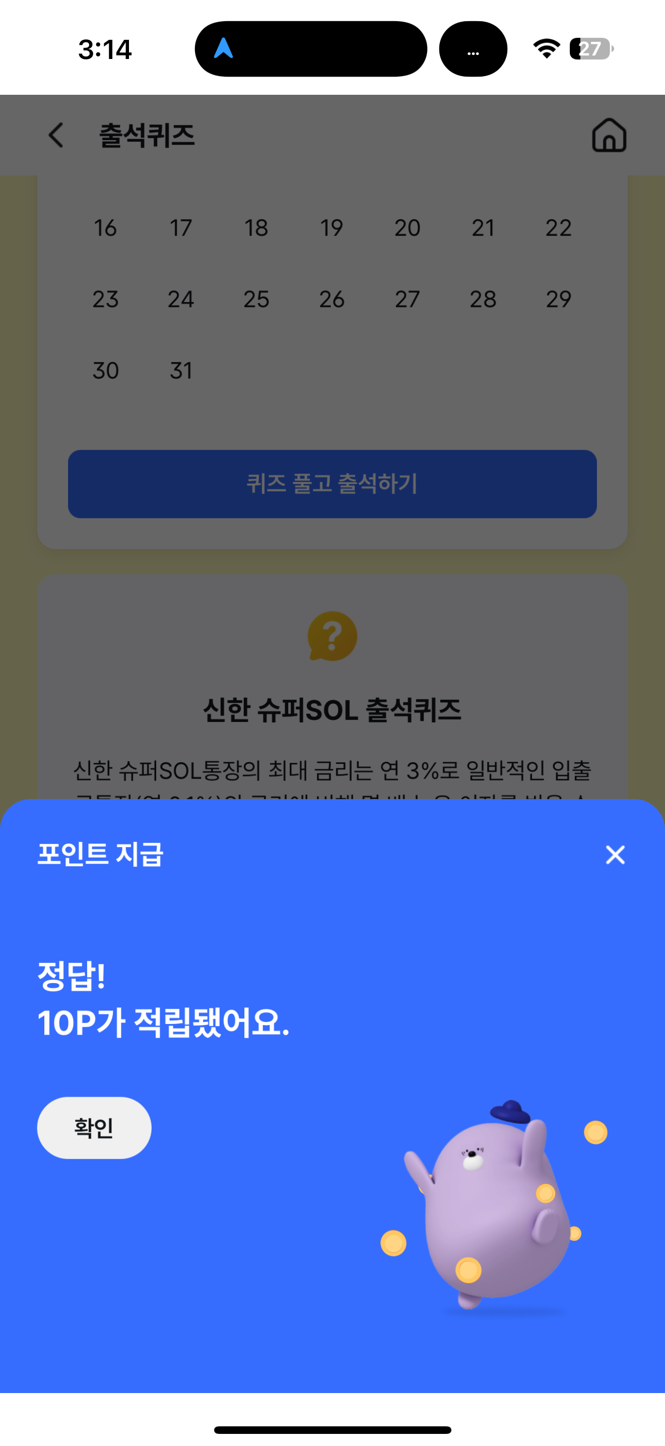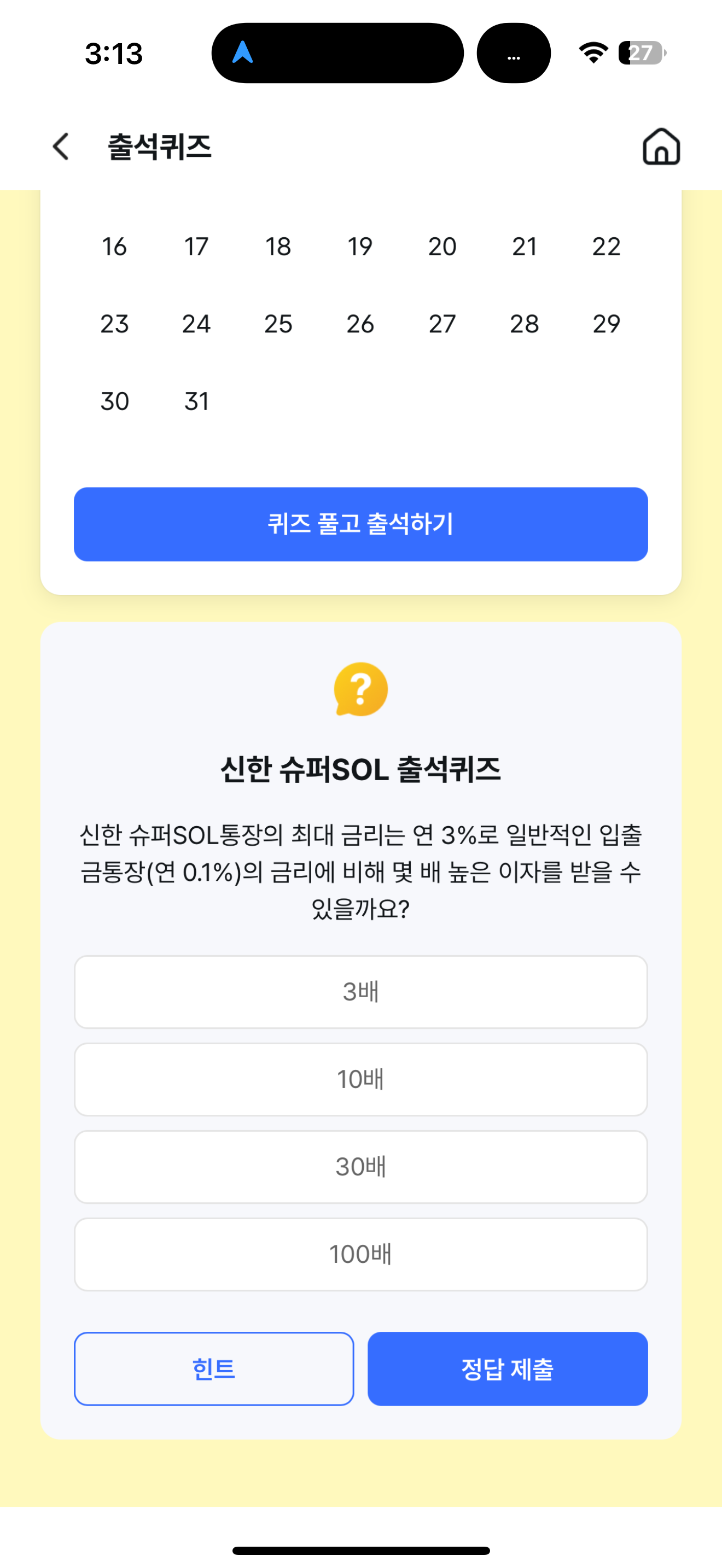신한 슈퍼SOL 출석퀴즈 정답은 30배 입니다