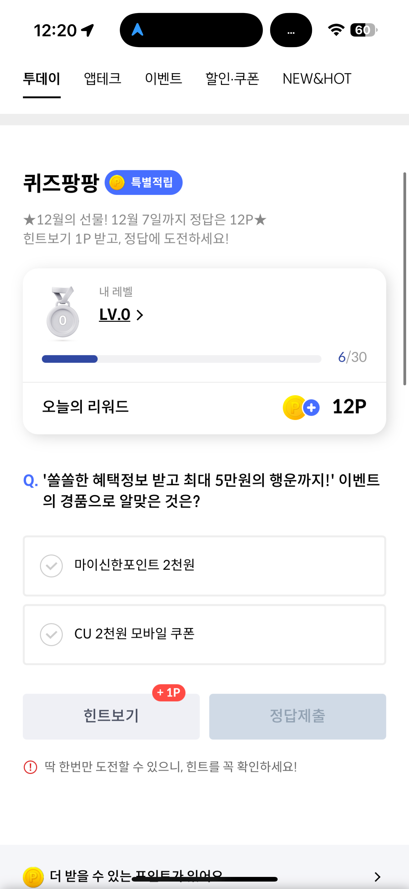 신한카드 퀴즈팡팡 12월 7일 문제입니다