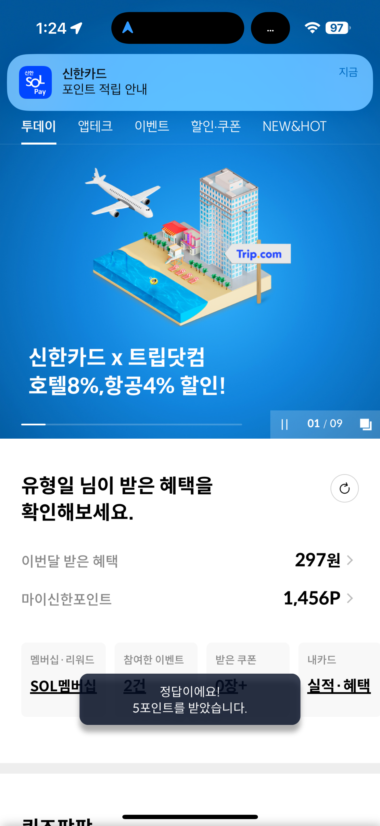신한카드 퀴즈팡팡 12월 9일 문제입니다