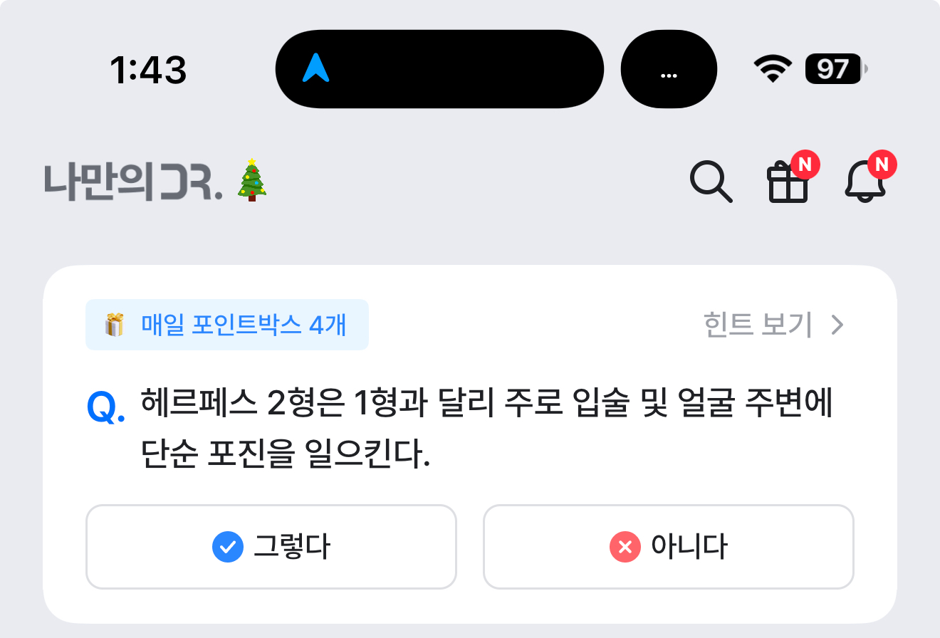 나만의 닥터 퀴즈 12월 9일 정답(헤르페스 2형은 1형과 달리 주로 입술 및 얼굴 주변에 단순 포진을 일으킨다)