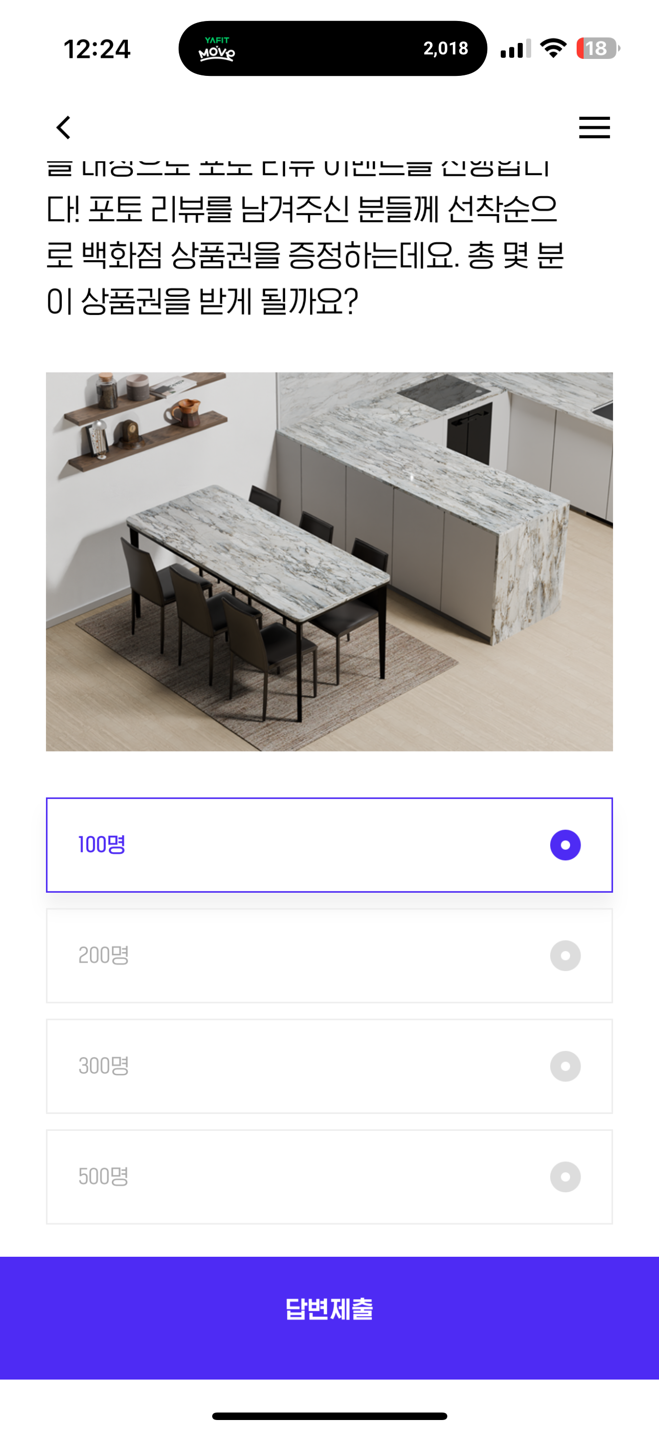 종합 건자재 기업, 현대L&C가 12월 한 달간 거주/상업 공간에서 다양하게 활용되는 천연강화석 ' 칸스톤 ' 을 사용하고 계신 분들을 대상으로 포토 리뷰 이벤트를 진행합니다! 포토 리뷰를 남겨주신 분들께 선착순으로 백화점 상품권을 증정하는데요. 총 몇 분이 상품권을 받게 될까요? 보기는 1. 100명 2. 200명 3. 300명 4. 500명