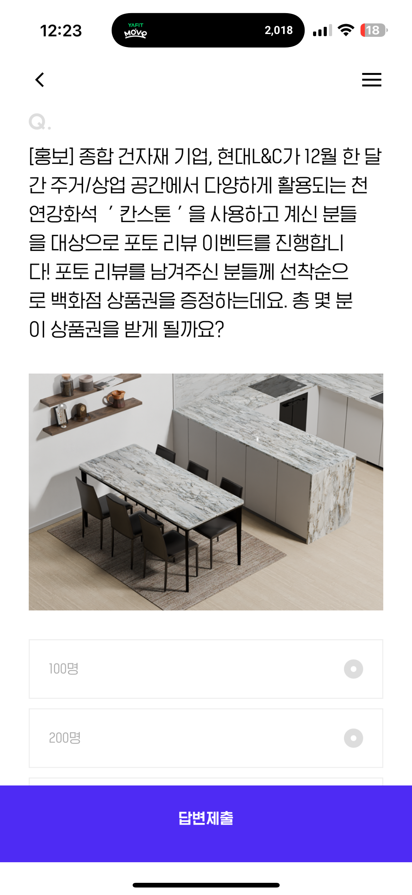 종합 건자재 기업, 현대L&C가 12월 한 달간 거주/상업 공간에서 다양하게 활용되는 천연강화석 ' 칸스톤 ' 을 사용하고 계신 분들을 대상으로 포토 리뷰 이벤트를 진행합니다! 포토 리뷰를 남겨주신 분들께 선착순으로 백화점 상품권을 증정하는데요. 총 몇 분이 상품권을 받게 될까요? 보기는 1. 100명 2. 200명 3. 300명 4. 500명