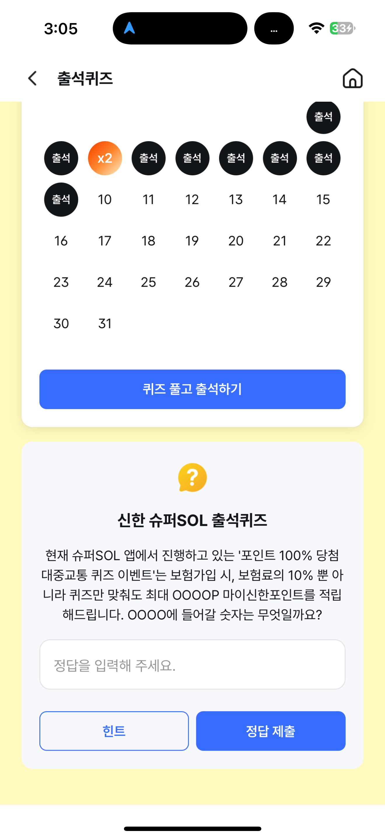 현재 슈퍼SOL 앱에서 진행하고 있는 '포인트 100% 당첨 대중교통 퀴즈 이벤트'는 보험가입 시, 보험료의 10% 뿐 아니라 퀴즈만 맞춰도 최대 OOOOP 마이신한포인트를 적립해드립니다. OOOO에 들어갈 숫자는 무엇일까요? 주관식 퀴즈인데요. 대중교통 퀴즈 이벤트로 포인트를 받을 수 있으니 도전해 보세요