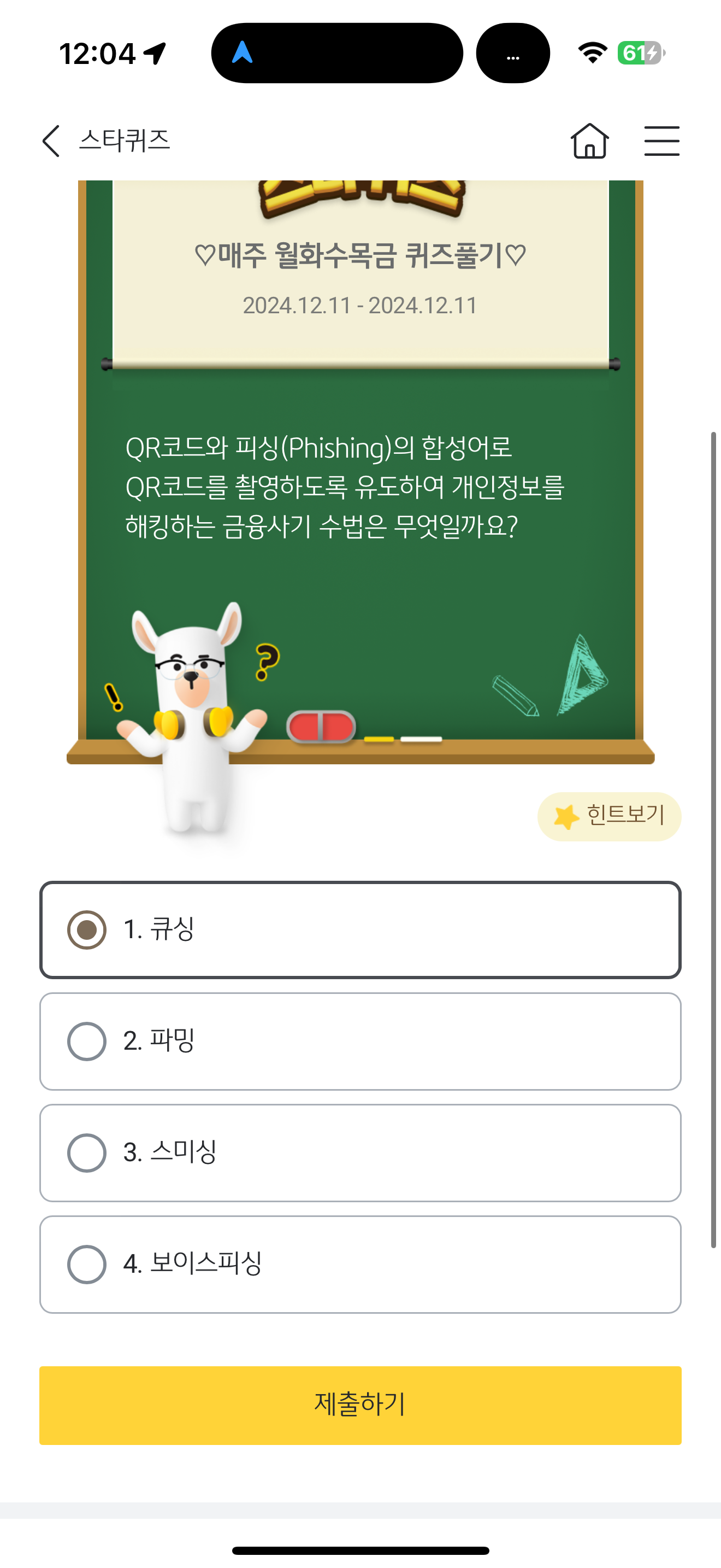 KB스타뱅킹 스타퀴즈 정답은 큐싱 입니다