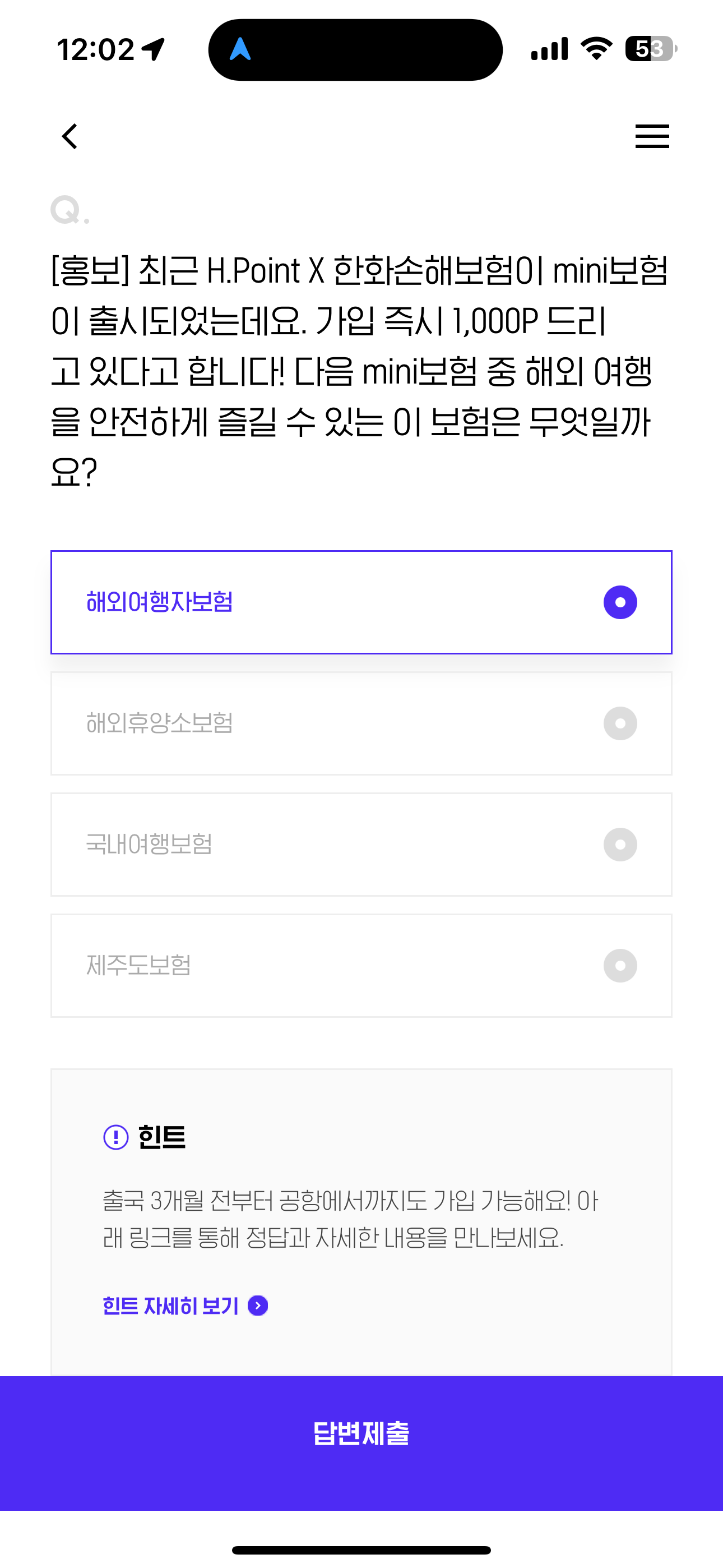 H포인트 퀴즈 정답은 해외여행자보험 입니다