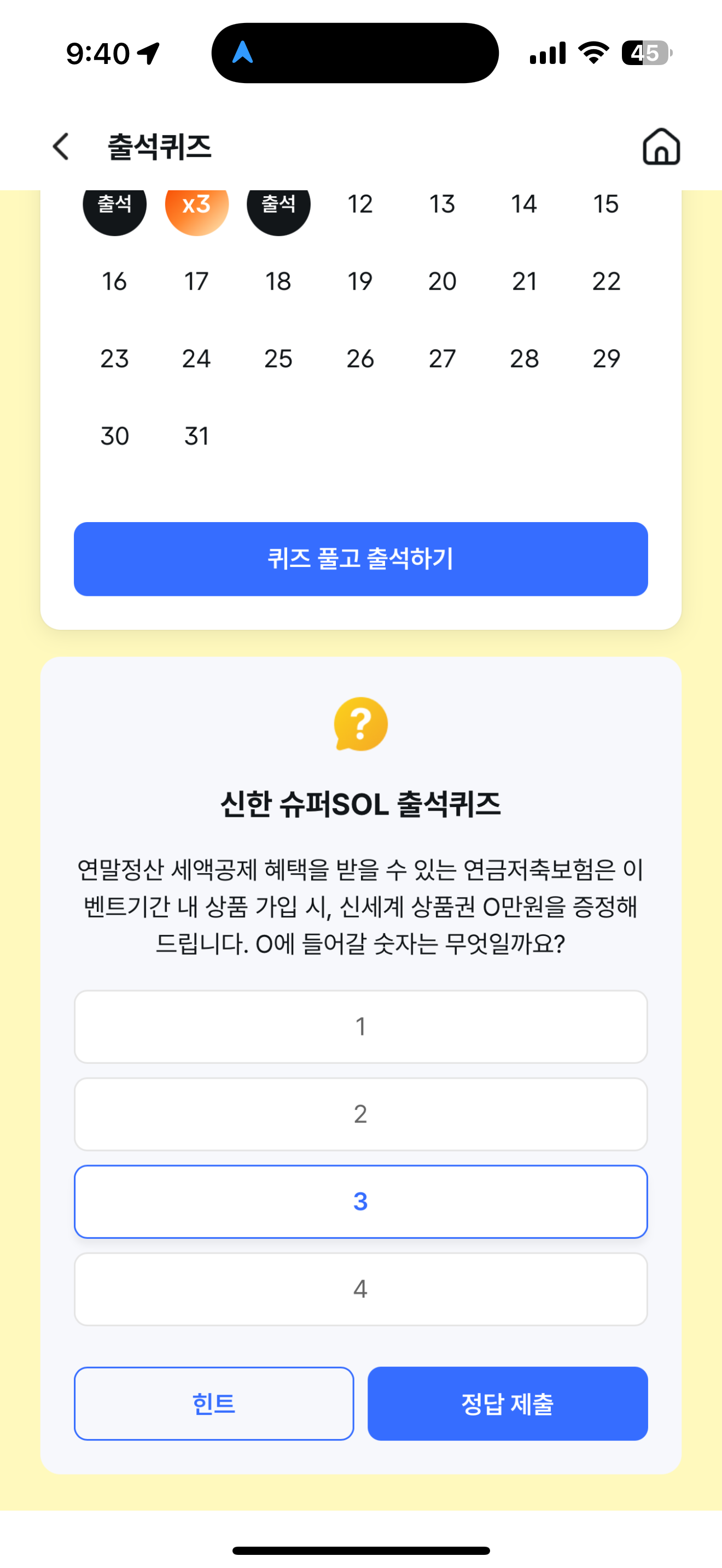신한 슈퍼SOL 출석퀴즈 정답은 3 입니다