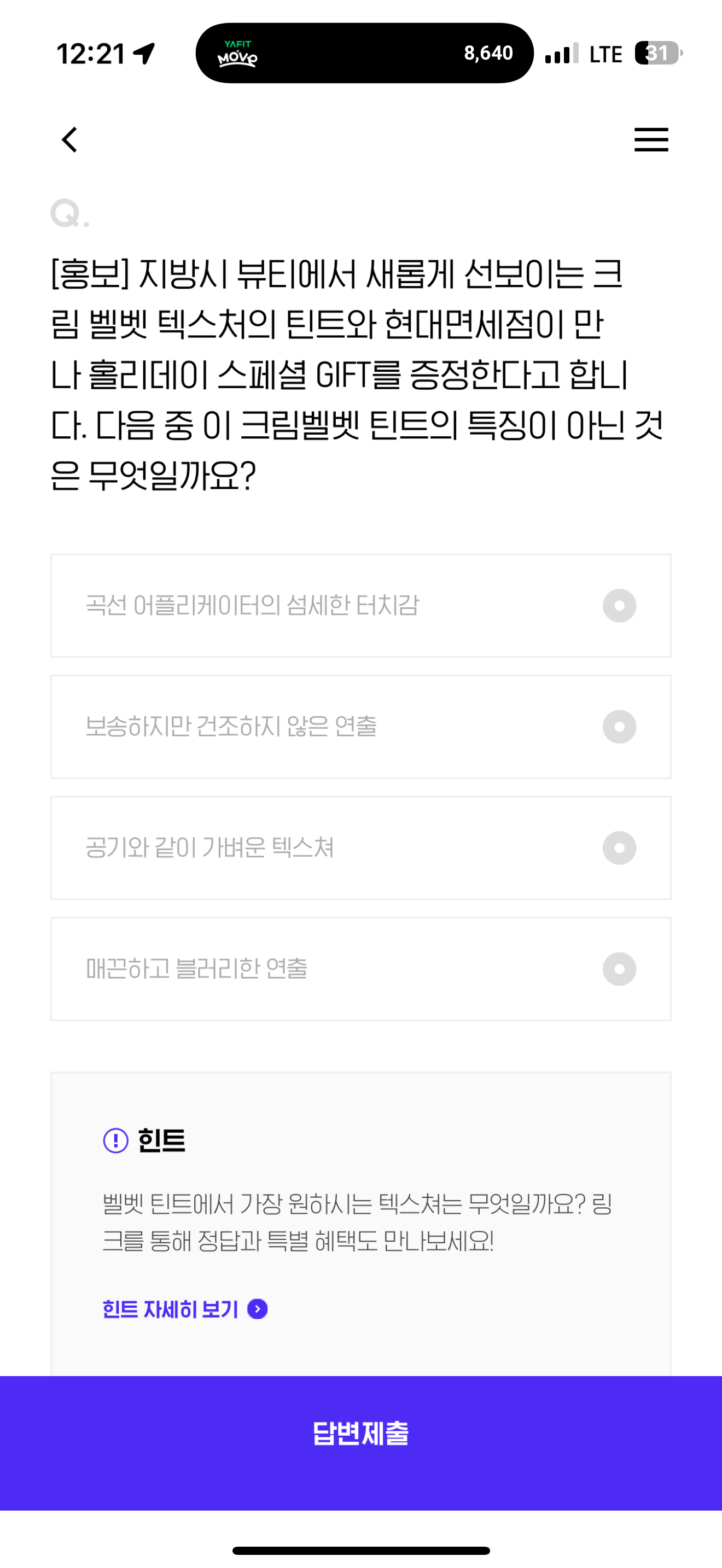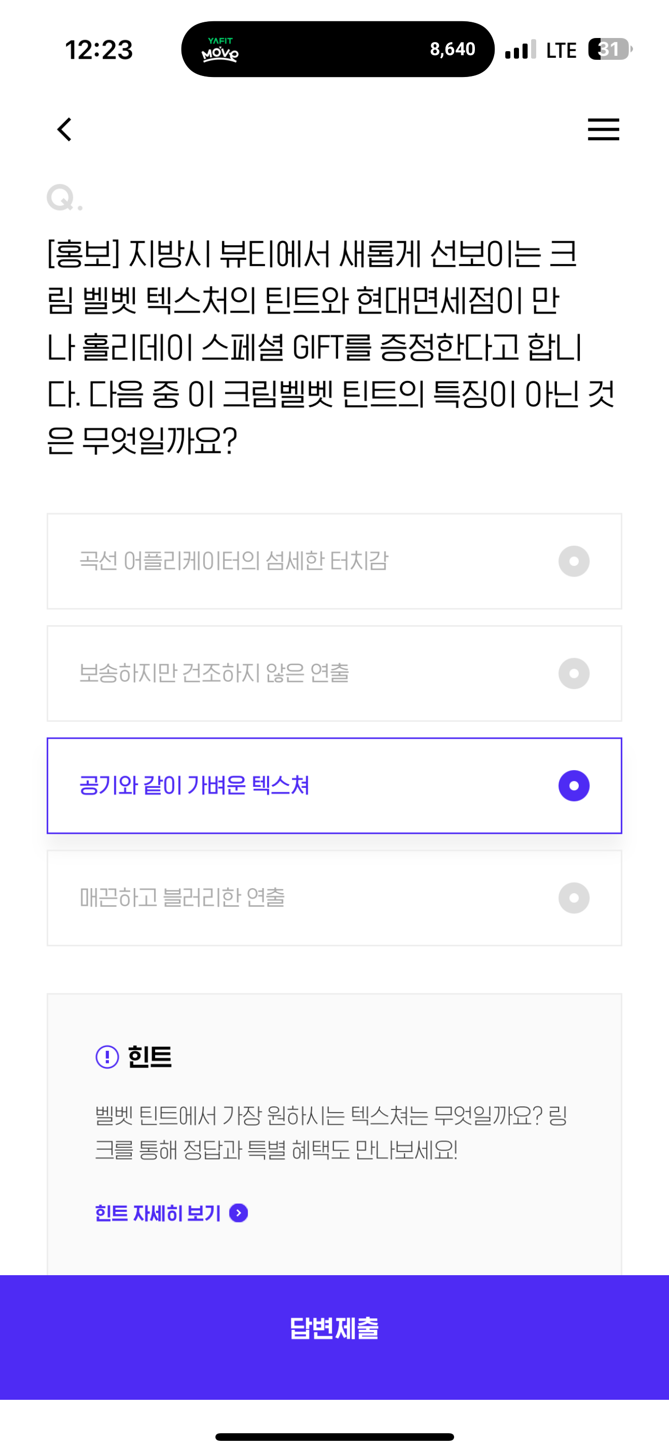 H포인트 퀴즈 정답은 공기와 같이 가벼운 텍스처 입니다