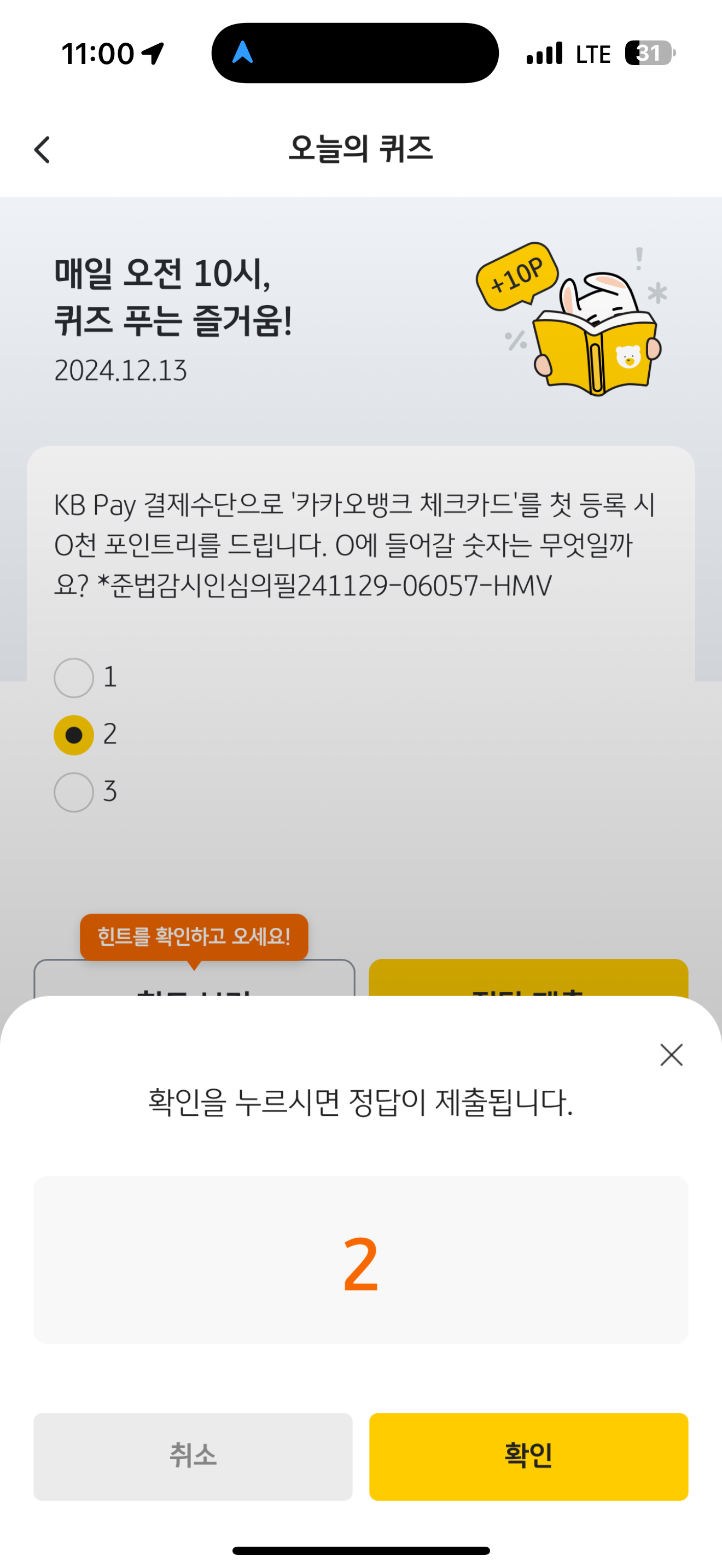 Kb pay 오늘의 퀴즈 정답은 2 입니다