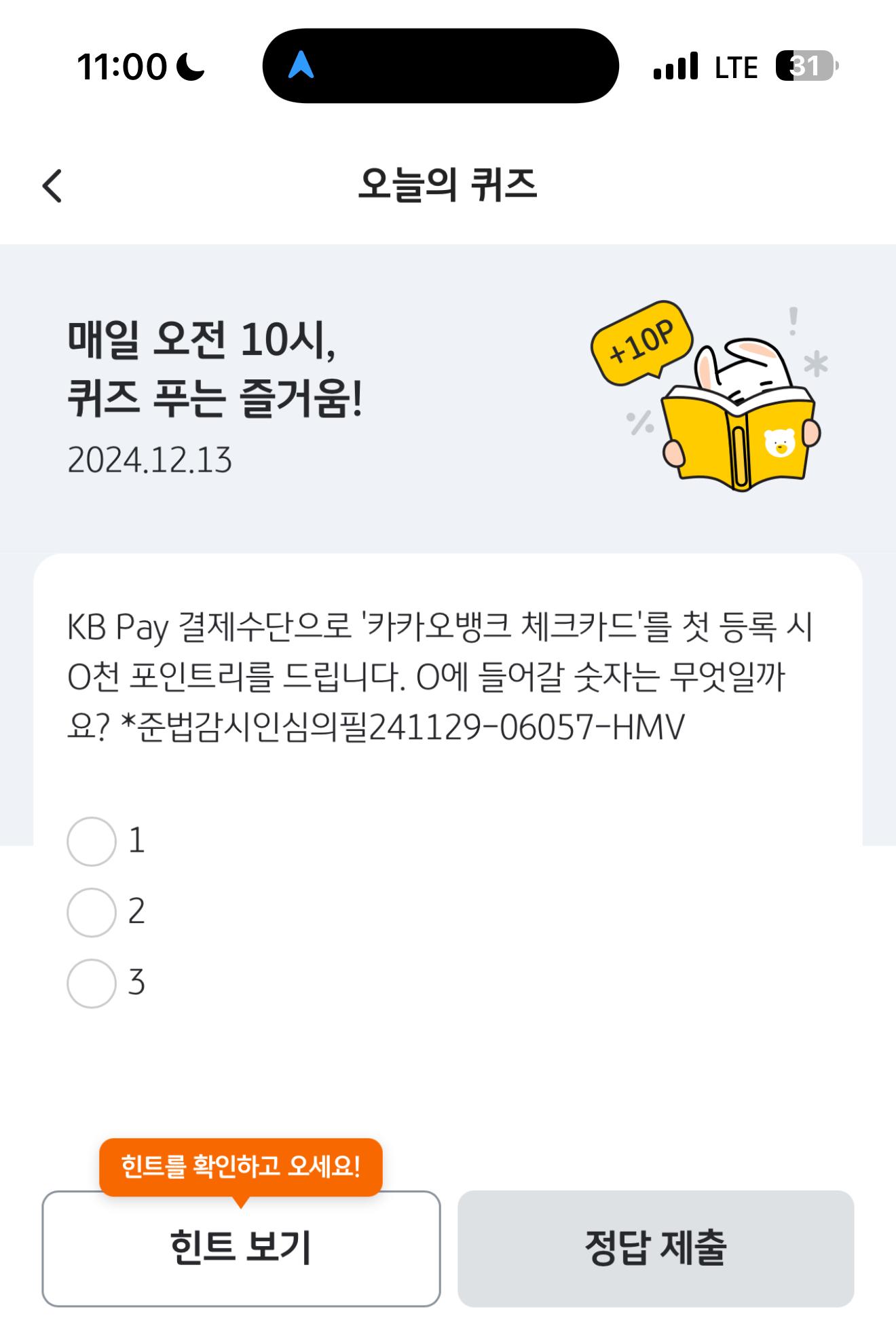 KB pay 오늘의 퀴즈 12월 13일 문제입니다