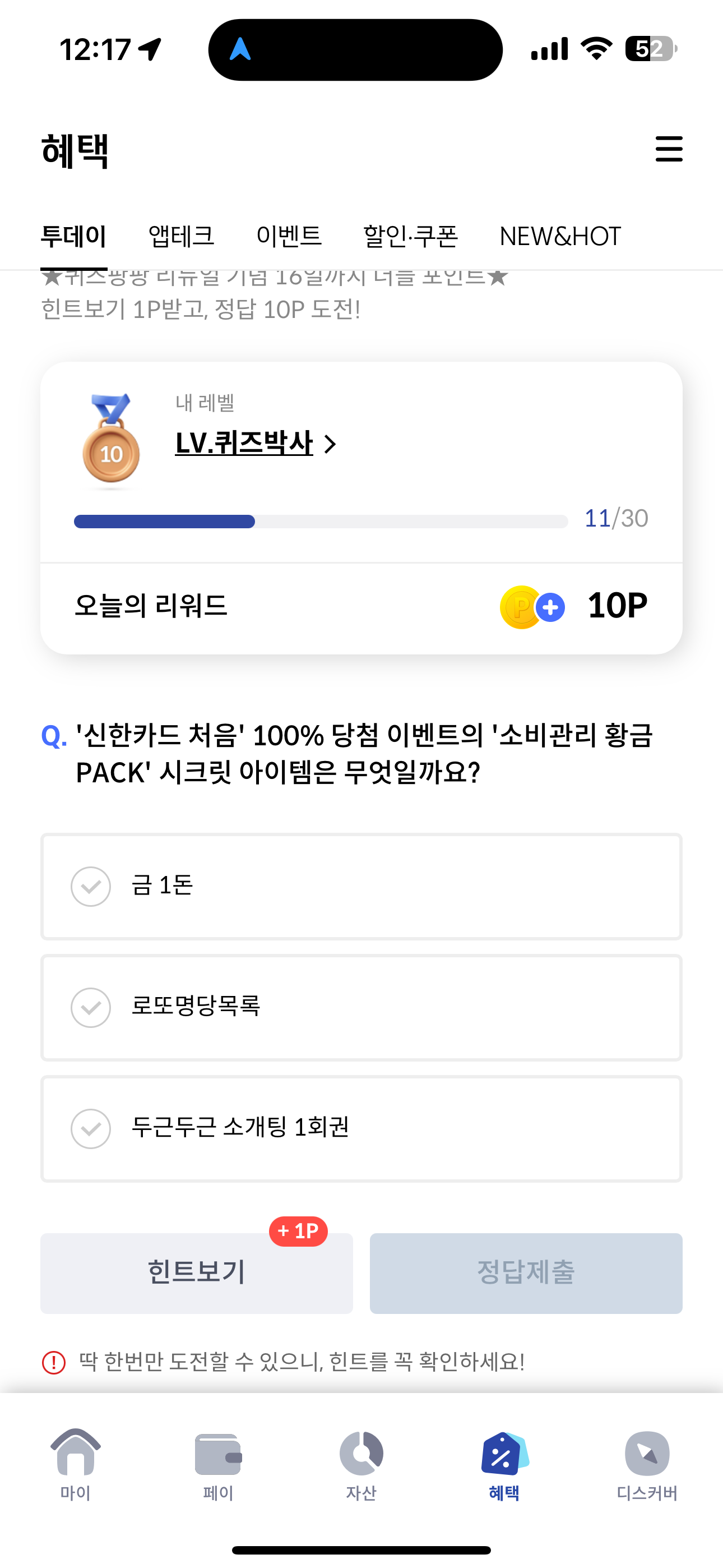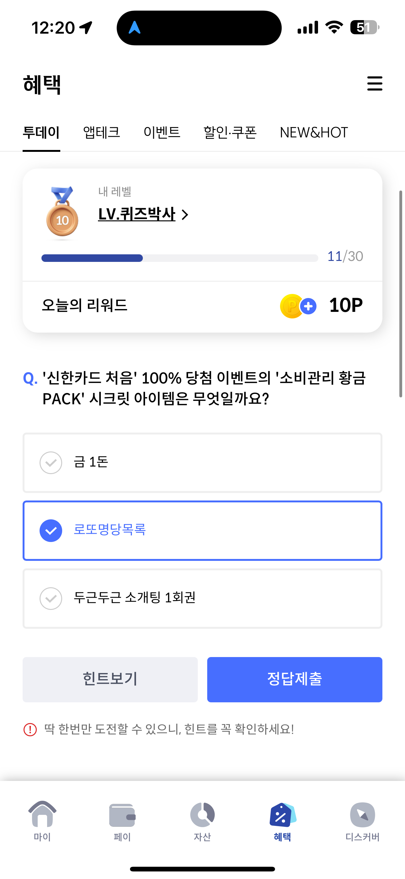 신한카드 퀴즈팡팡 정답은 로또명당목록 입니다