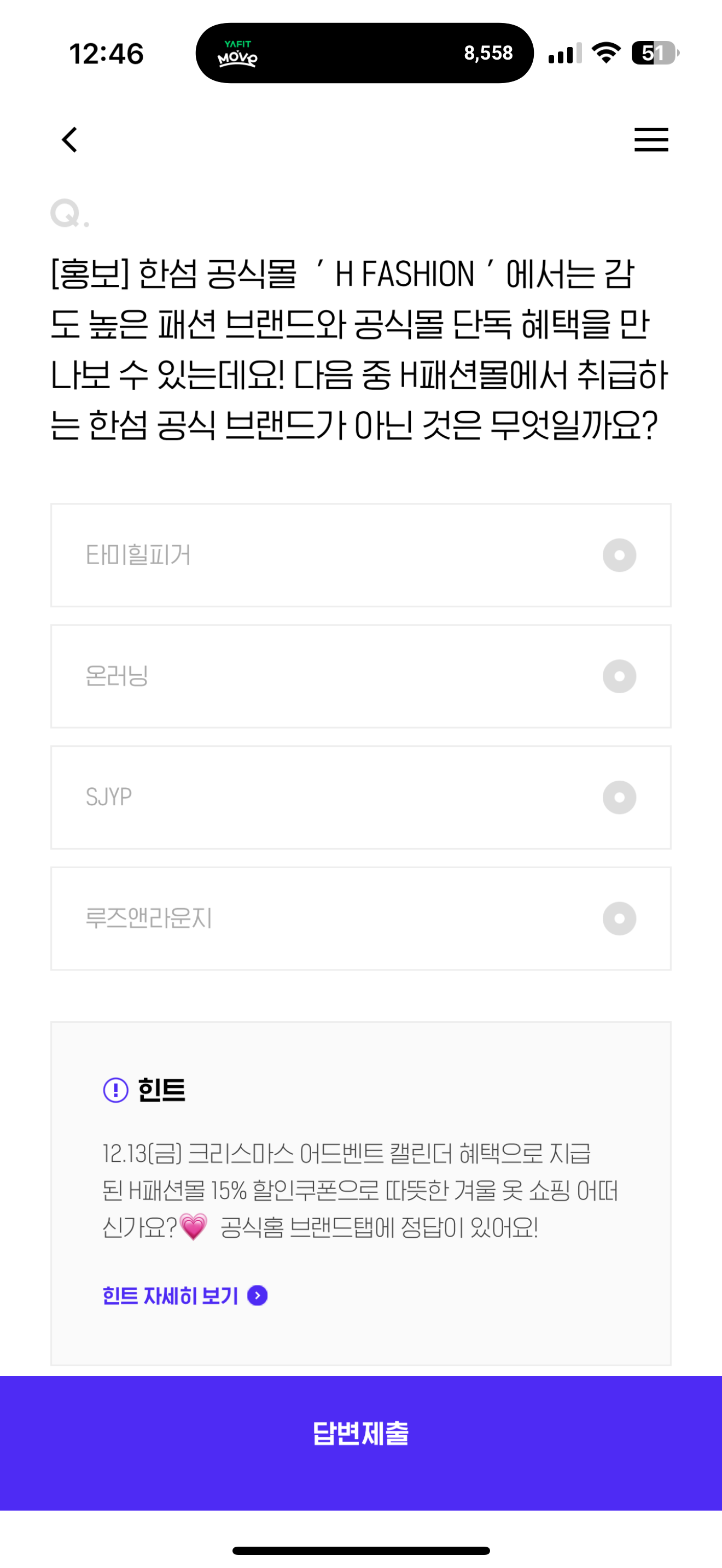 한섬 공식몰 ' H FASHION ' 에서는 감도 높은 패션 브랜드와 공식몰 단독 혜택을 만나보 수 있는데요! 다음 중 H패션몰에서 취급하는 한섬 공식 브랜드가 아닌 것은 무엇일까요? 보기는 1. 타미힐피거 2. 온러닝 3. SJYP 4. 루즈앤라운지 입니다. 한섬 공식몰에는 수많은 브랜드가 있으니 참고해 보세요