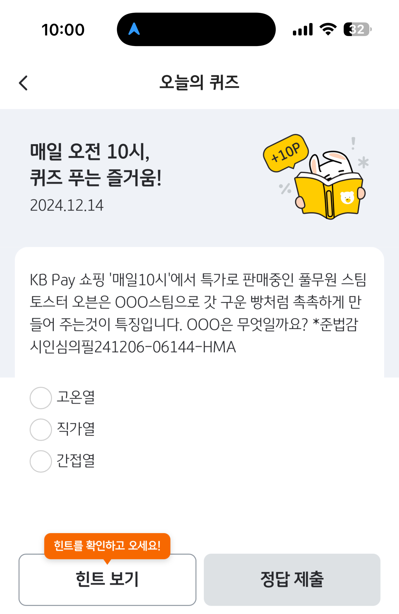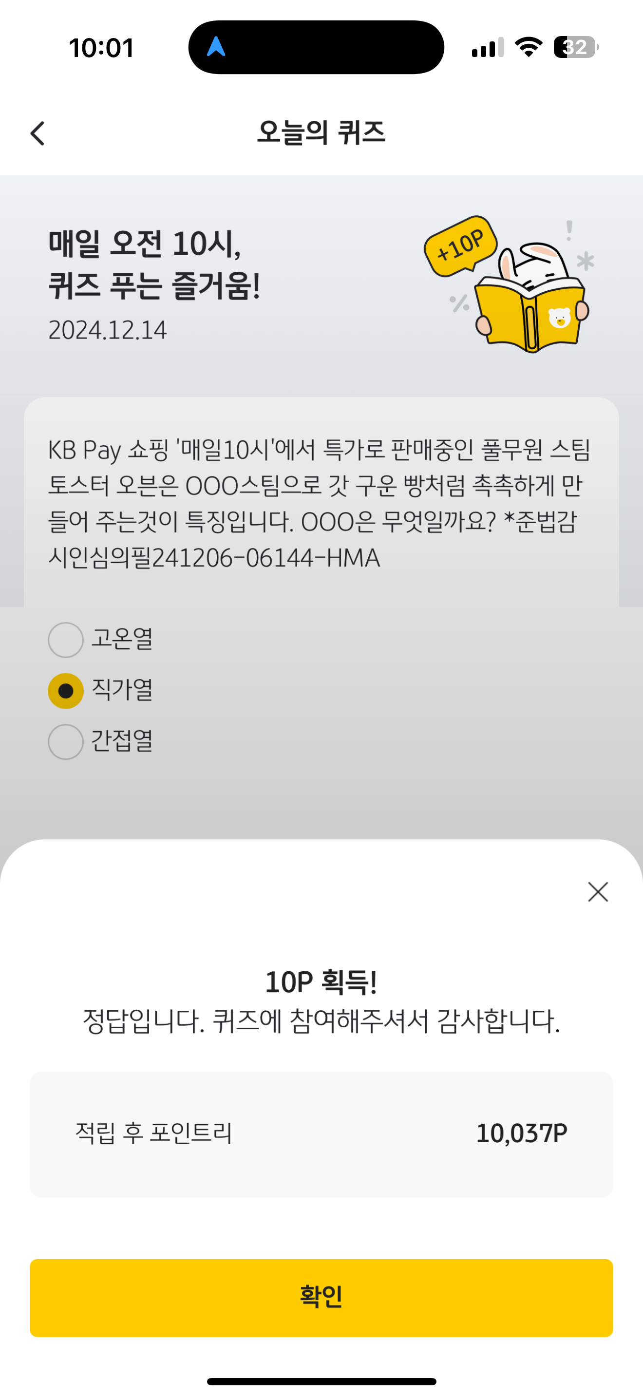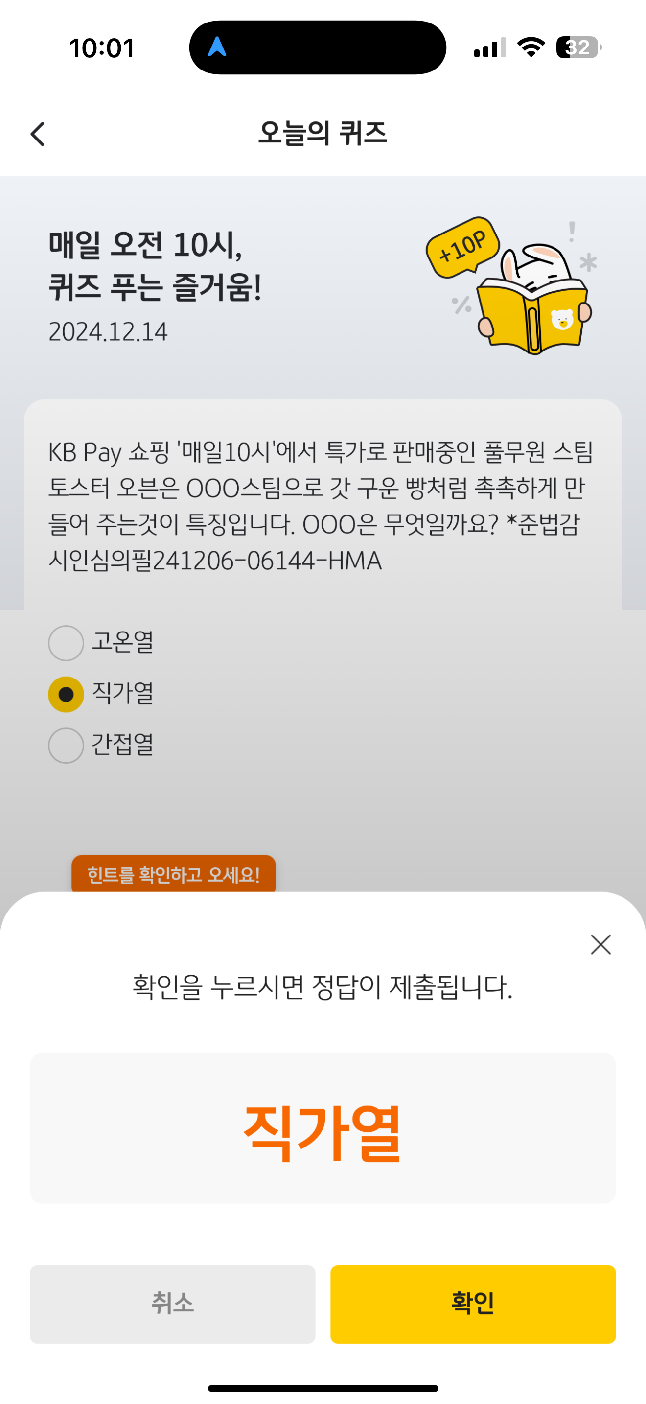KB Pay 오늘의 퀴즈 정답은 직가열 입니다