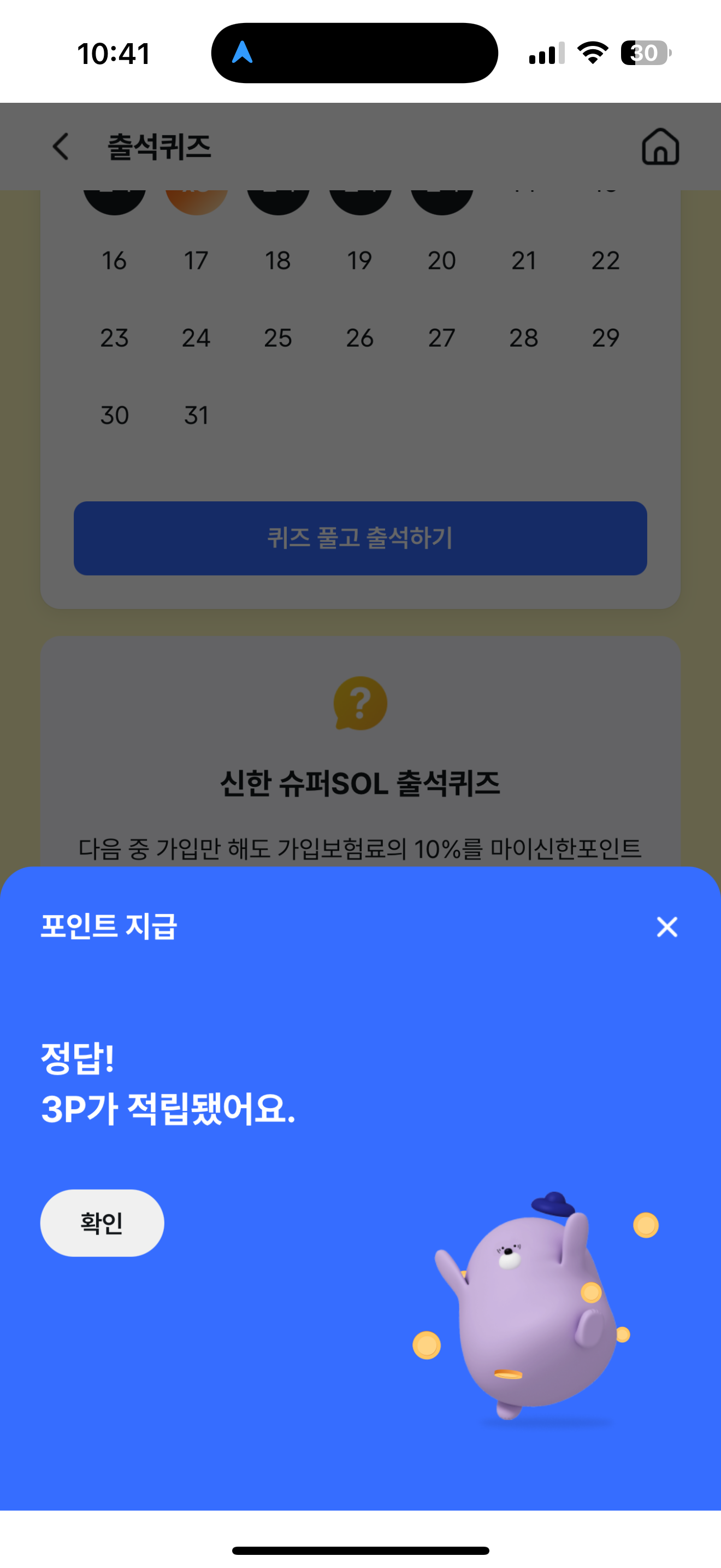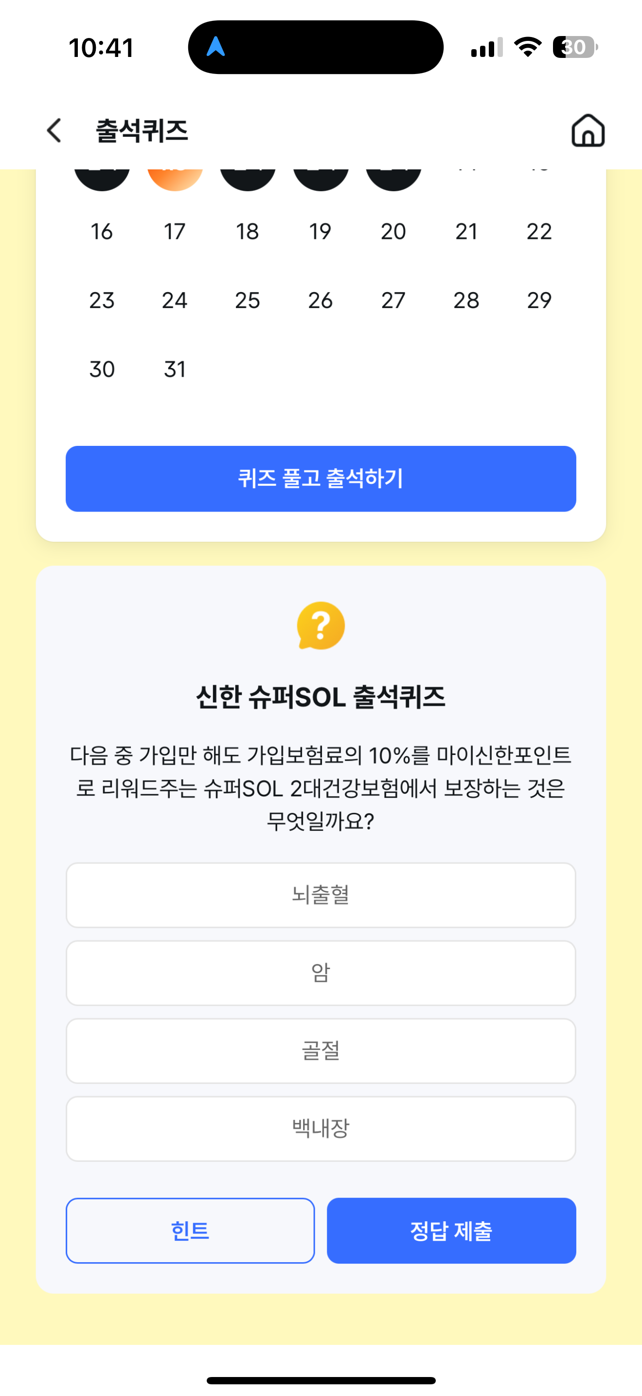 신한 슈퍼SOL 출석퀴즈 정답은 뇌출혈 입니다