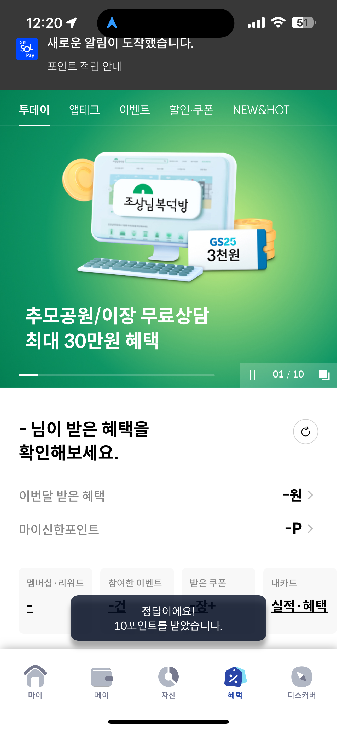 신한카드 퀴즈팡팡 정답은 로또명당목록 입니다