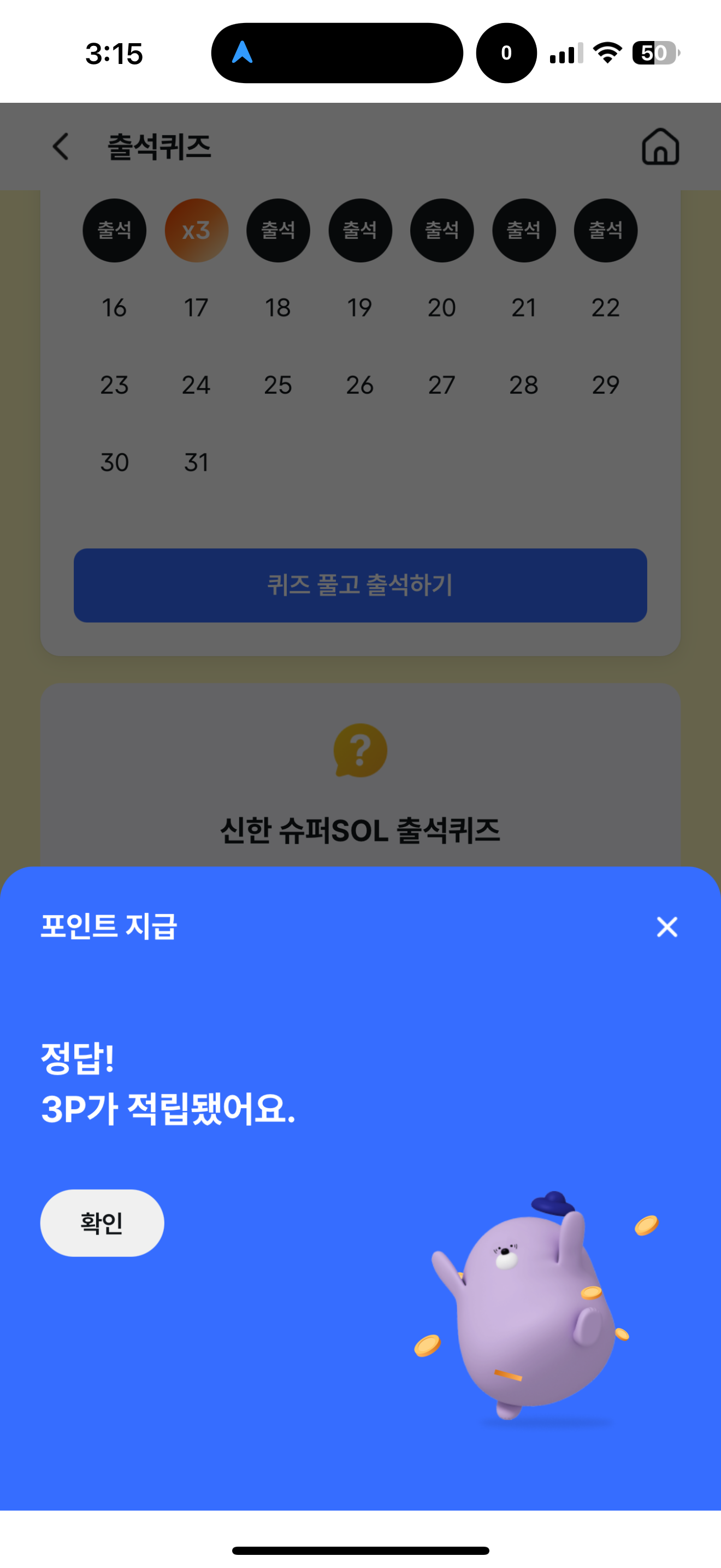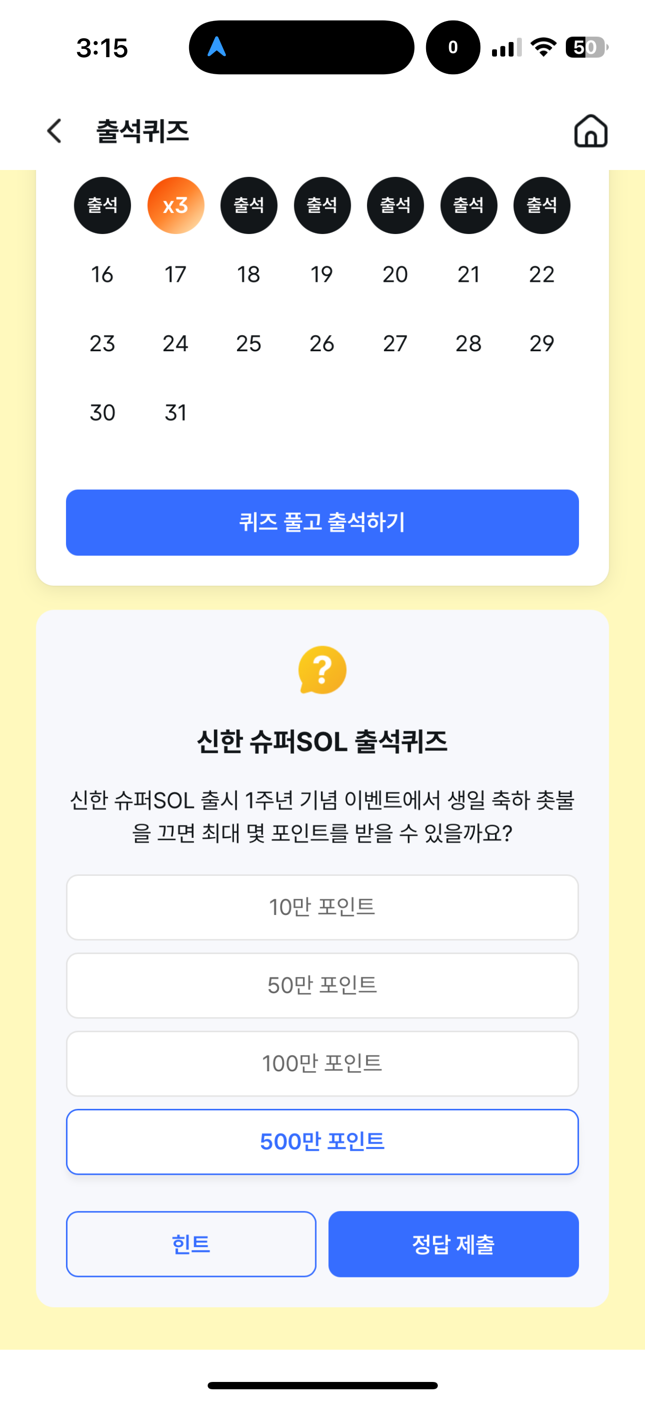 신한 슈퍼SOL 출석퀴즈 정답은 500만 포인트 입니다