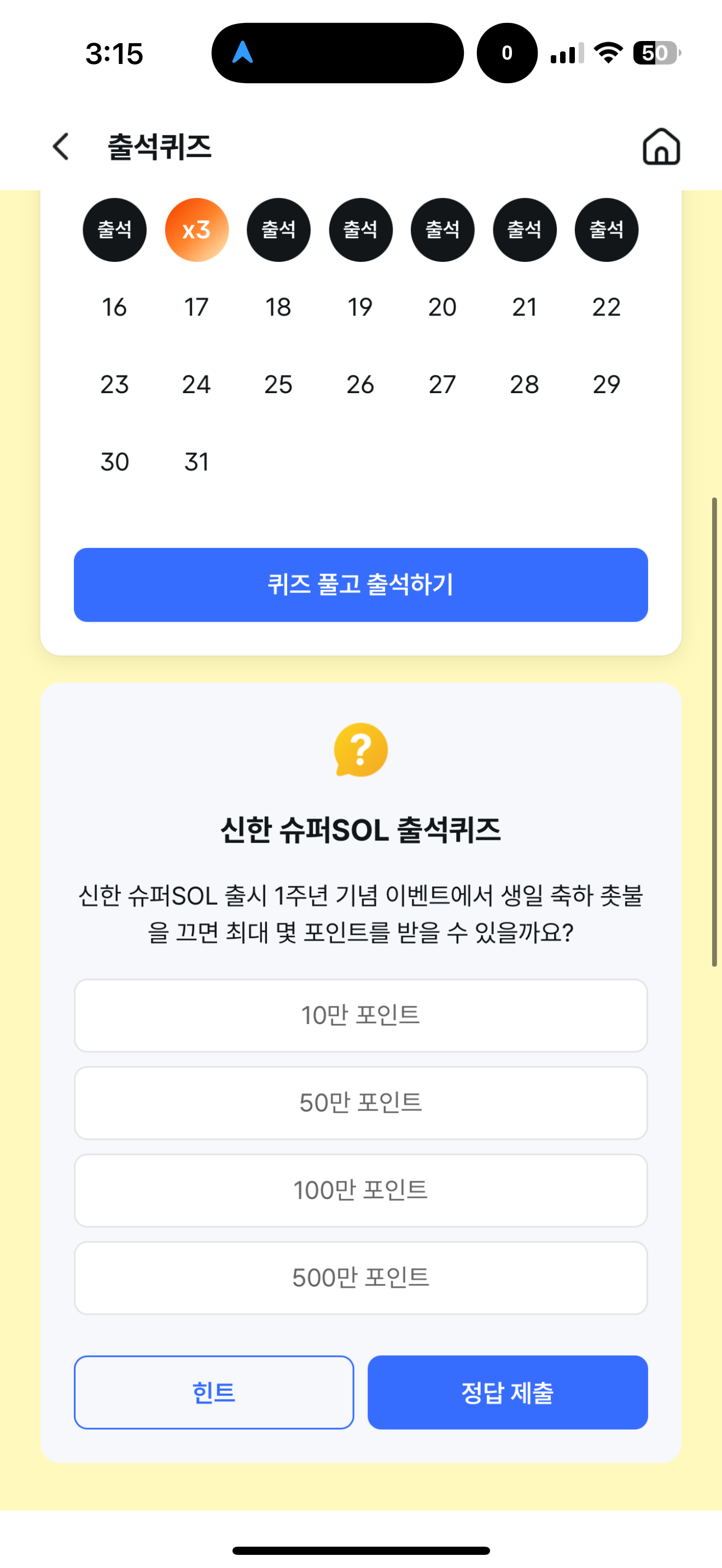 신한 슈퍼SOL 출석퀴즈 정답은 500만 포인트 입니다