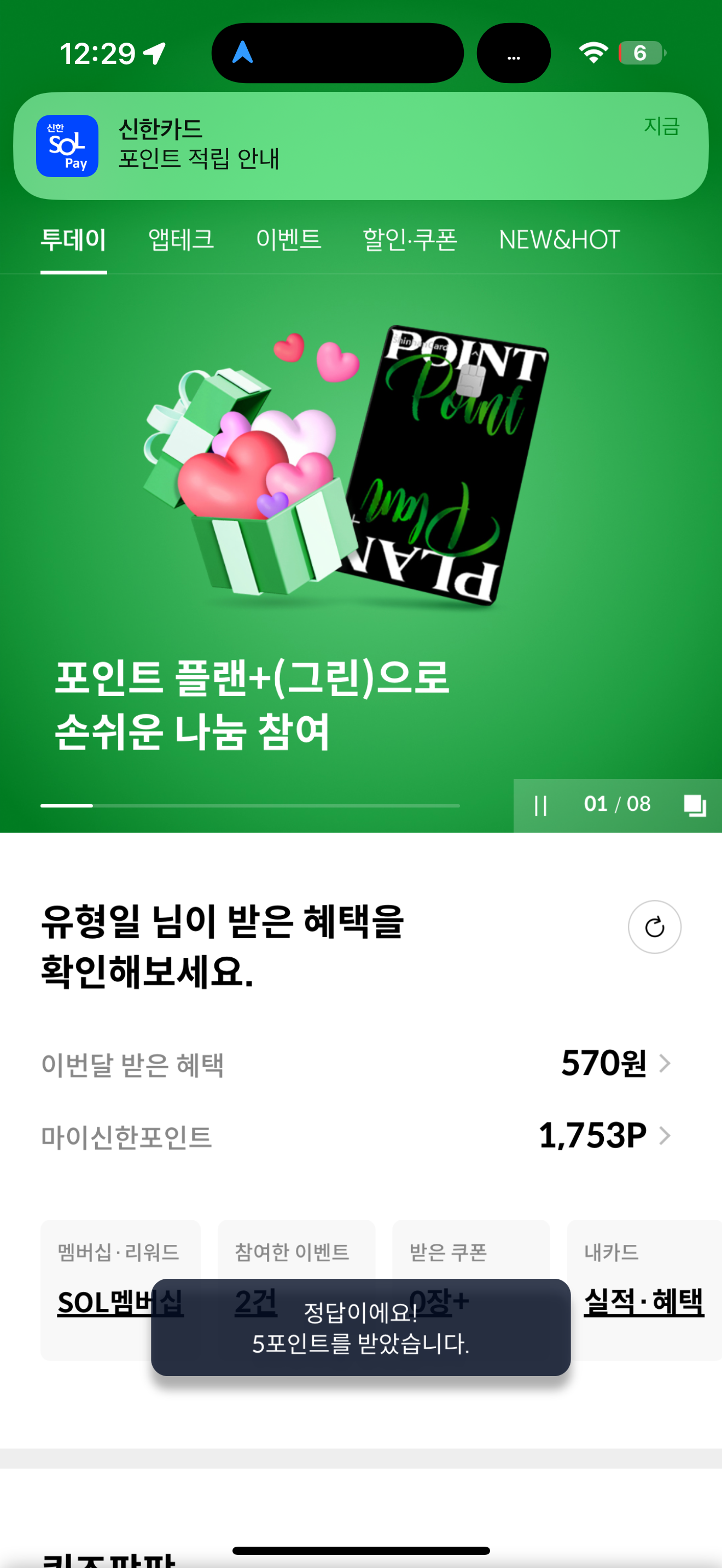 신한카드 퀴즈팡팡 정답은 500만 포인트 입니다